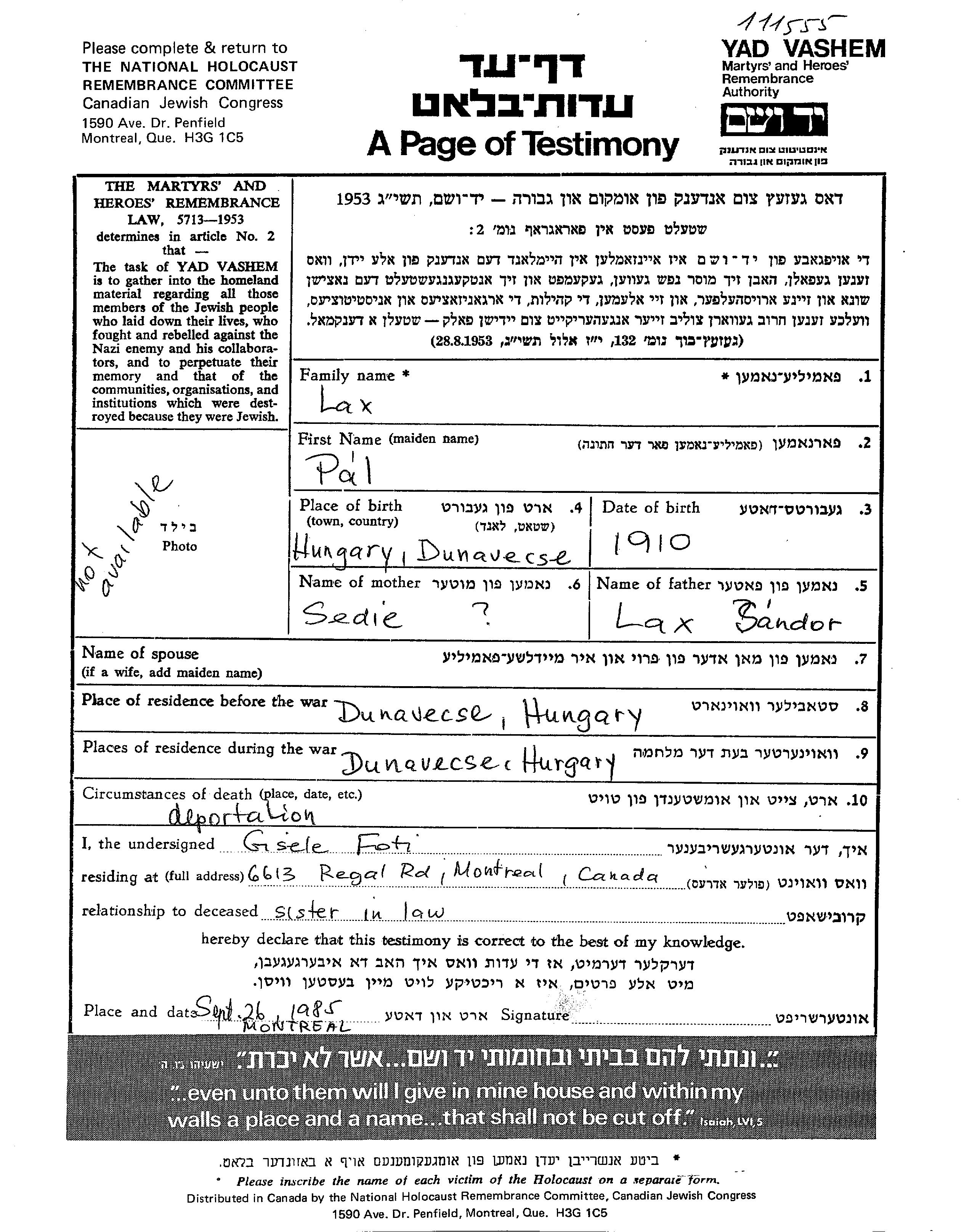 Pal Lax wurde im Jahr 1910 in Dunavecse, Ungarn geboren. Er war der Sohn von Sandor und Sadie. Er war mit Viola Verheiratet. Vor dem Zweiten Weltkrieg lebte er in Dunavecse, Ungarn. Während des Krieges war er in Dunavecse, Ungarn.