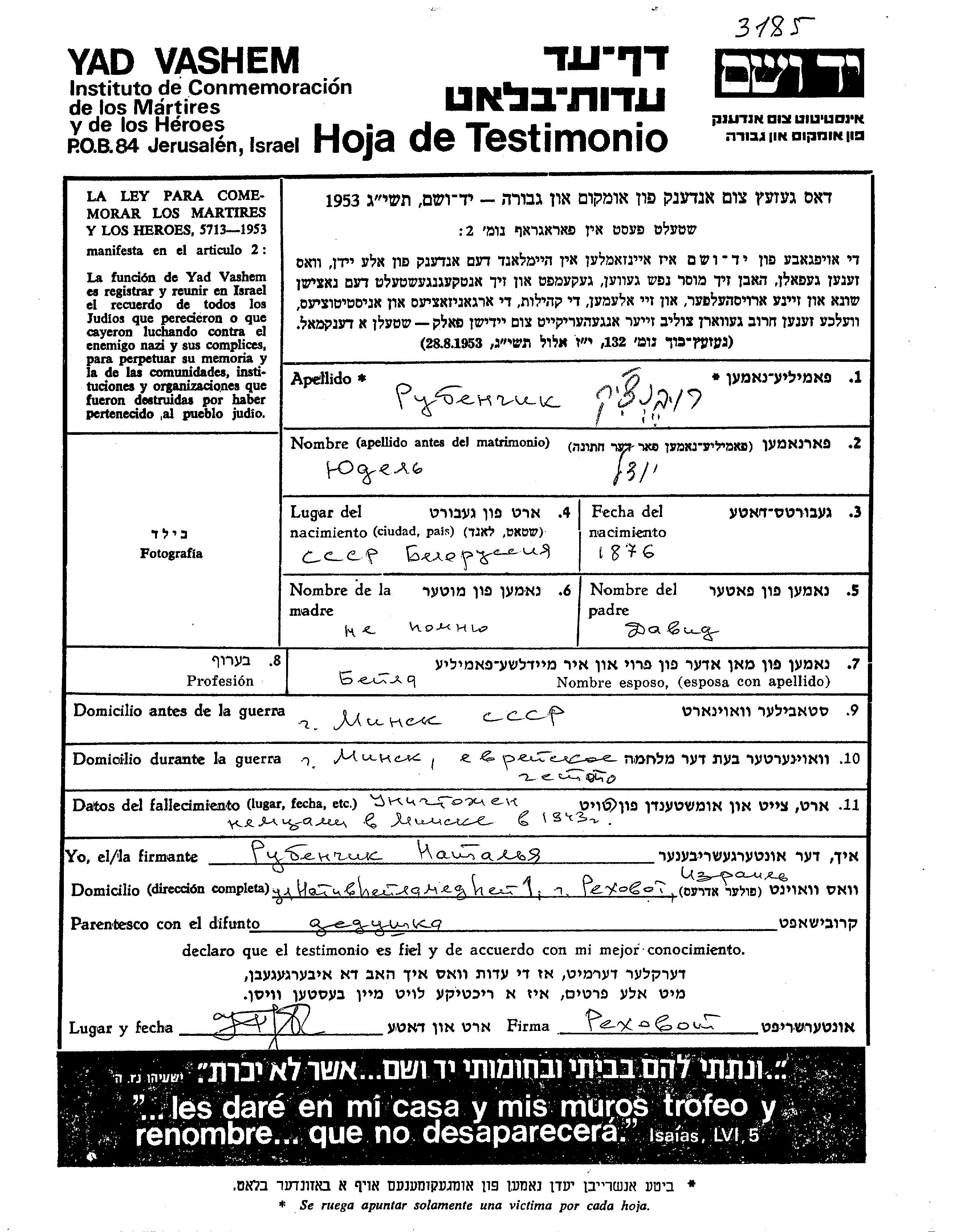 Yudel wurde in der Schoah ermordet. Todesort: Minsk, Weißrussland (UdSSR) im Jahr 1943.