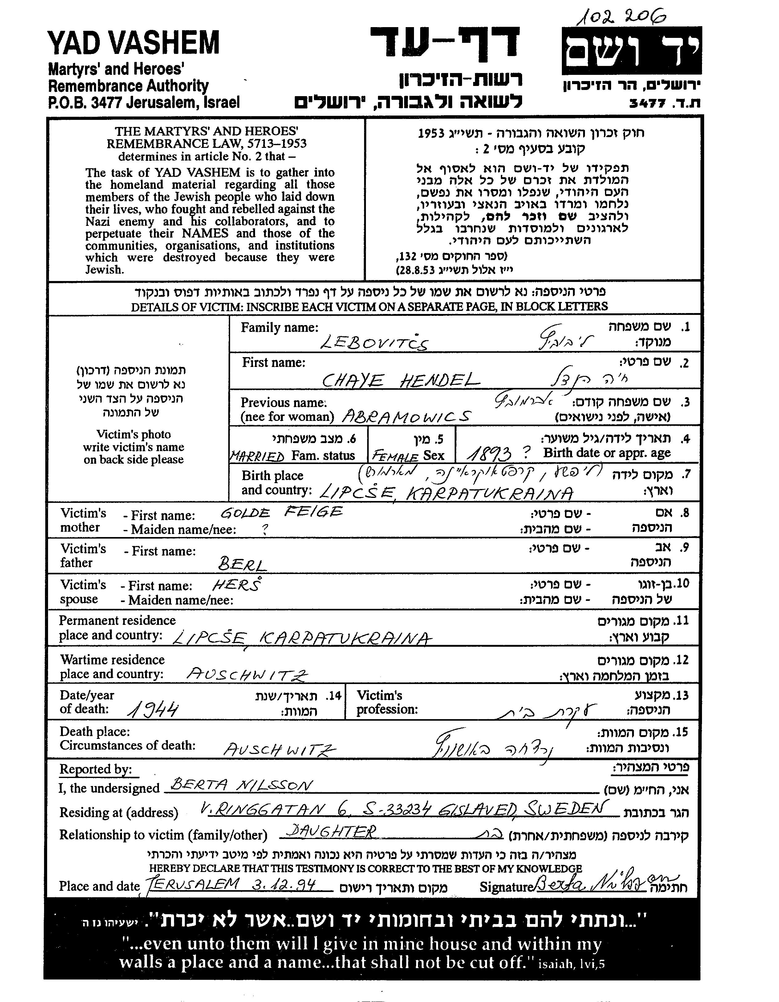 Chaye Hendel Lebovitcs, geb. Abramowics wurde im Jahr 1893 in Lipcse, Tschechoslowakei geboren. Sie war die Tochter von Berl und Feiga Golda. Sie war Hausfrau und mit Hers Verheiratet. Vor dem Zweiten Weltkrieg lebte sie in Lipcse, Tschechoslowakei. Während des Krieges war sie in Tschechoslowakei.