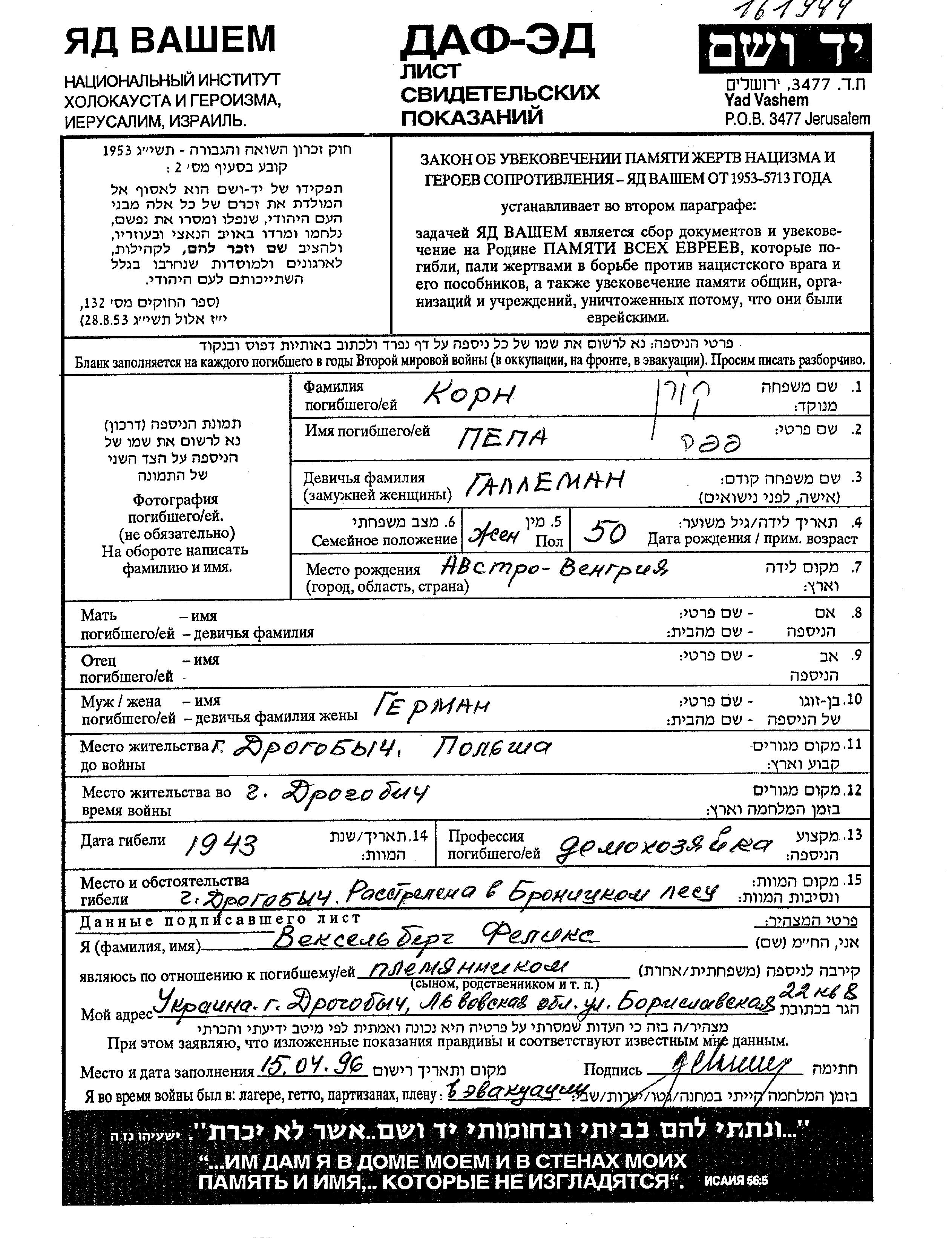 Pepa Korn, geb. Galleman Gelman wurde im Jahr 1893 in Österreich geboren. Sie war Hausfrau und mit German Verheiratet. Vor dem Zweiten Weltkrieg lebte sie in Drohobycz, Polen. Während des Krieges war sie in Drohobycz, Polen.