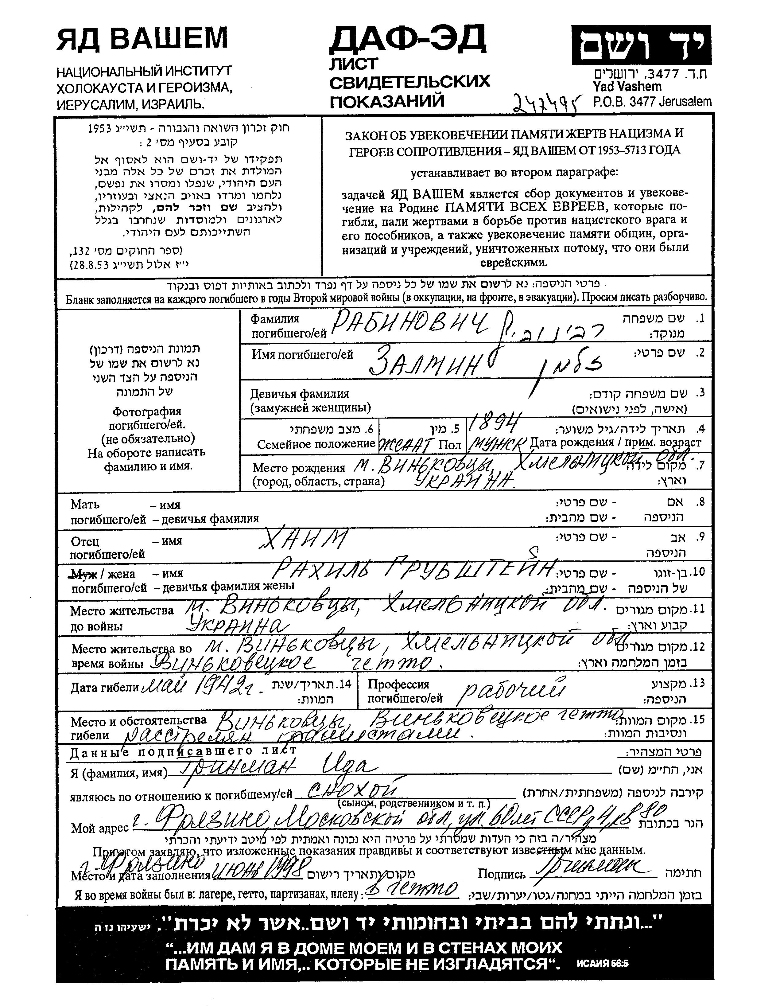 Zalmin Rabinovich wurde im Jahr 1894 in Vinkovtsy, Ukraine (UdSSR) geboren. Er war der Sohn von Khaim. Er war Arbeiter/-in und mit Rakhil Verheiratet. Vor dem Zweiten Weltkrieg lebte er in Vinkovtsy, Ukraine (UdSSR). Während des Krieges war er in Vinkovtsy, Ukraine (UdSSR).