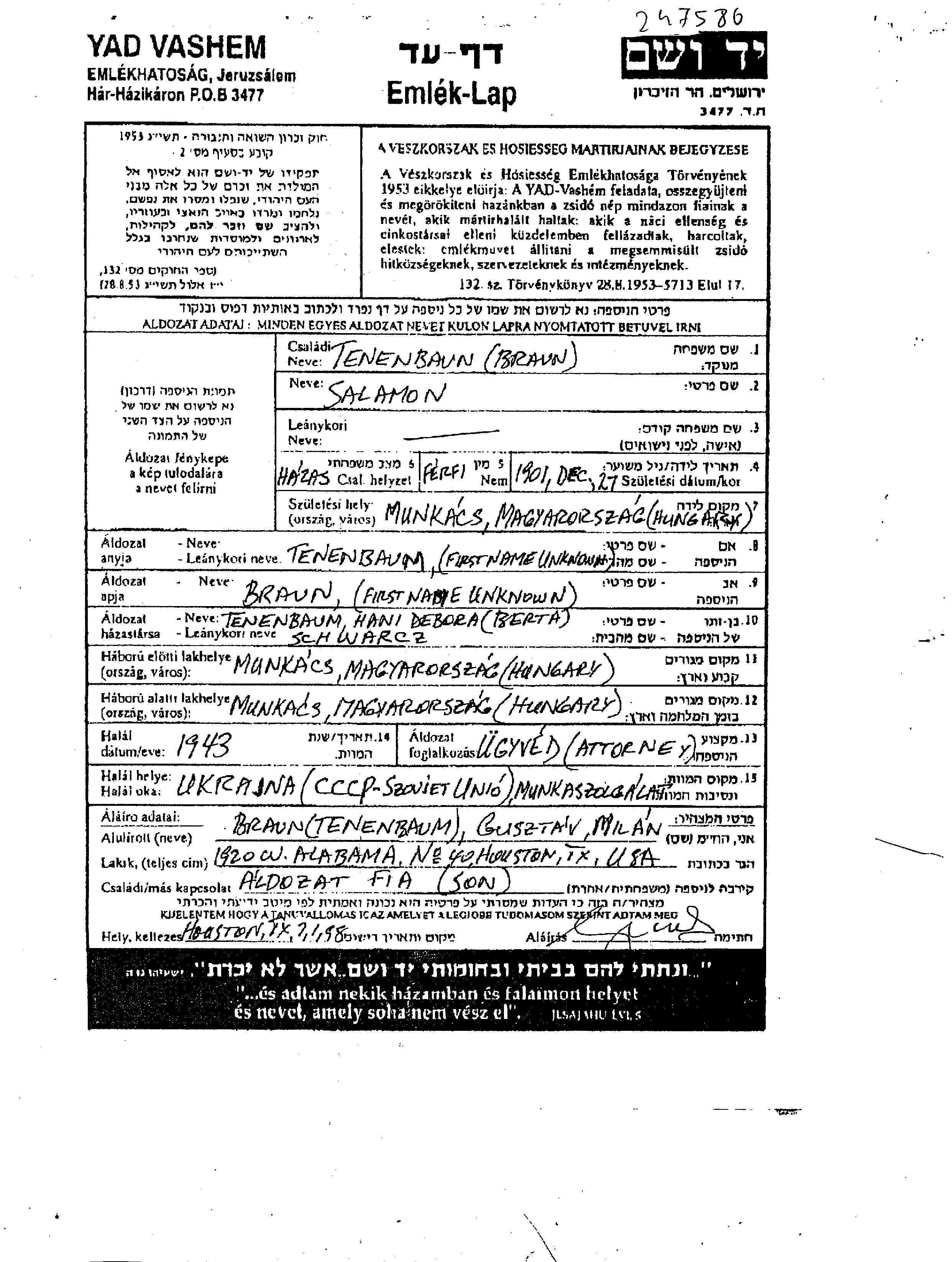 Salamon Tenenbaum Braun wurde im Jahr 1901 in Munkacs, Tschechoslowakei geboren. Er war Jurist und mit Hani Debora Khani Berta Verheiratet. Vor dem Zweiten Weltkrieg lebte er in Munkacs, Tschechoslowakei. Während des Krieges war er in Munkacs, Tschechoslowakei.
