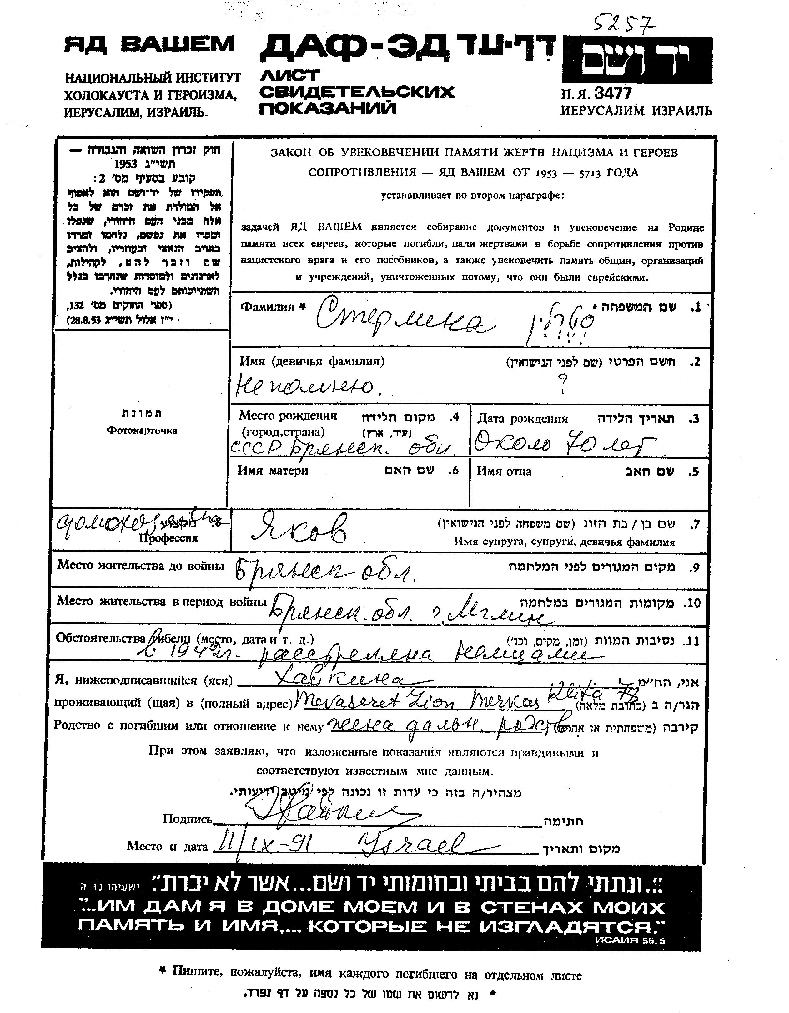 Vorname unbekannt Sterlin wurde in Orel, Russland (UdSSR) geboren. Sie war Hausfrau und mit Yakov Verheiratet. Vor dem Zweiten Weltkrieg lebte sie in Orel, Russland (UdSSR). Während des Krieges war sie in Mglin, Russland (UdSSR).