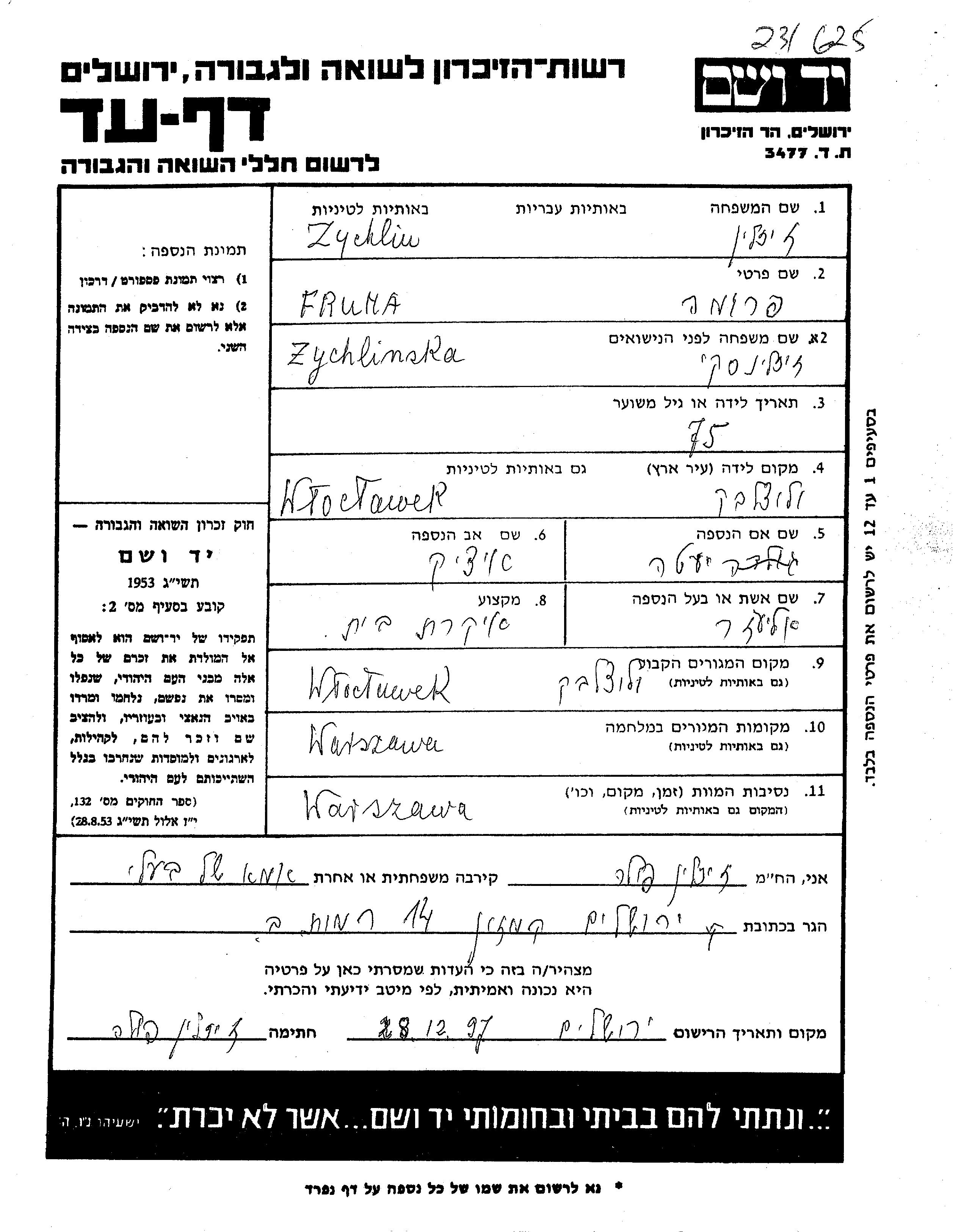 Fruma Zychlin, geb. Zychlinski wurde in Wloclawek, Polen geboren. Sie war die Tochter von Itzik und Yehudit. Sie war Hausfrau und mit Lazar Verheiratet. Vor dem Zweiten Weltkrieg lebte sie in Wloclawek, Polen. Während des Krieges war sie in Warszawa, Polen.