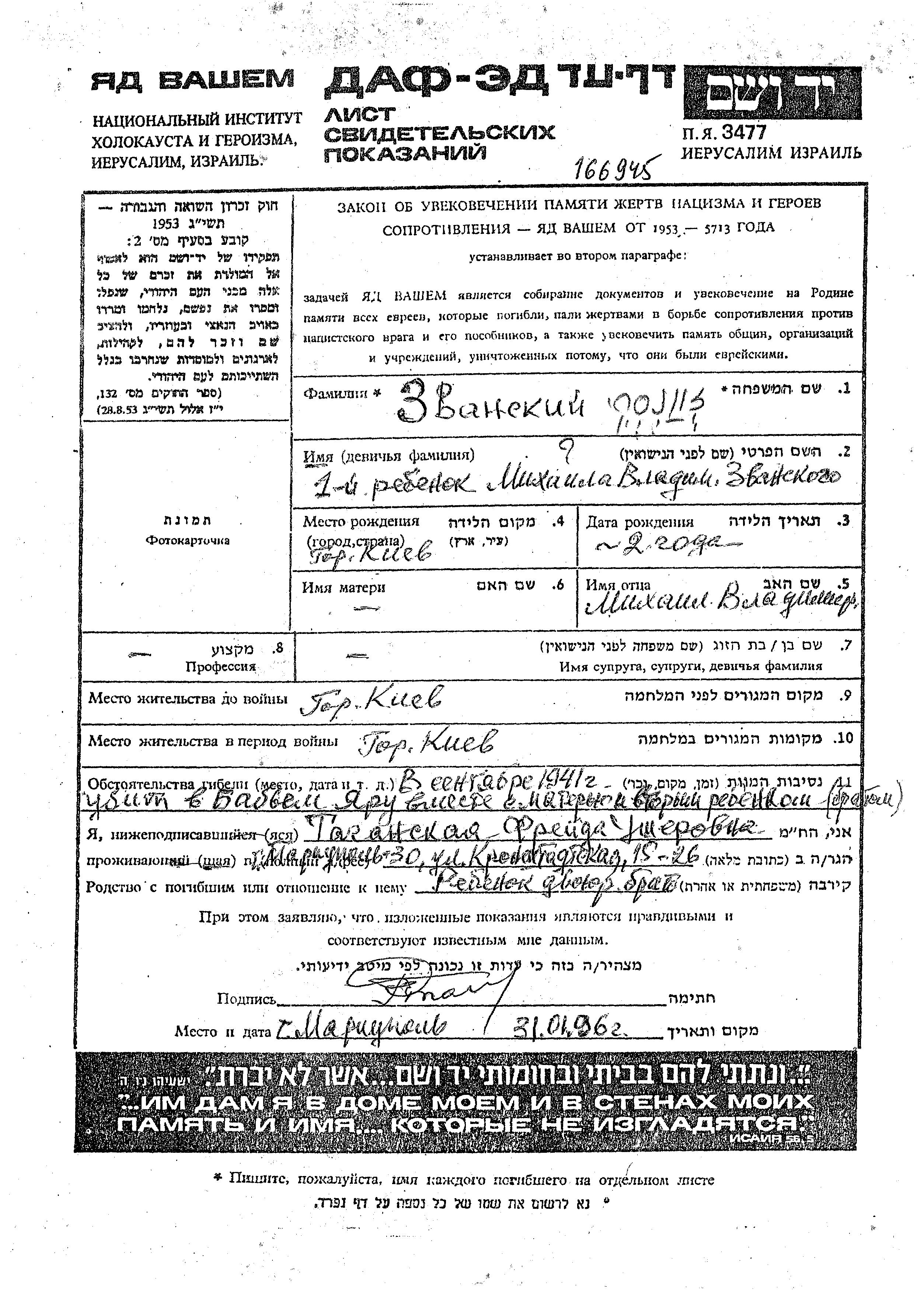 Vorname unbekannt Zvanski wurde im Jahr 1939 in Kiyev, Ukraine (UdSSR) geboren. Er war der Sohn von Mikhail. Er war Kind. Vor dem Zweiten Weltkrieg lebte er in Kiyev, Ukraine (UdSSR). Während des Krieges war er in Kiyev, Ukraine (UdSSR).