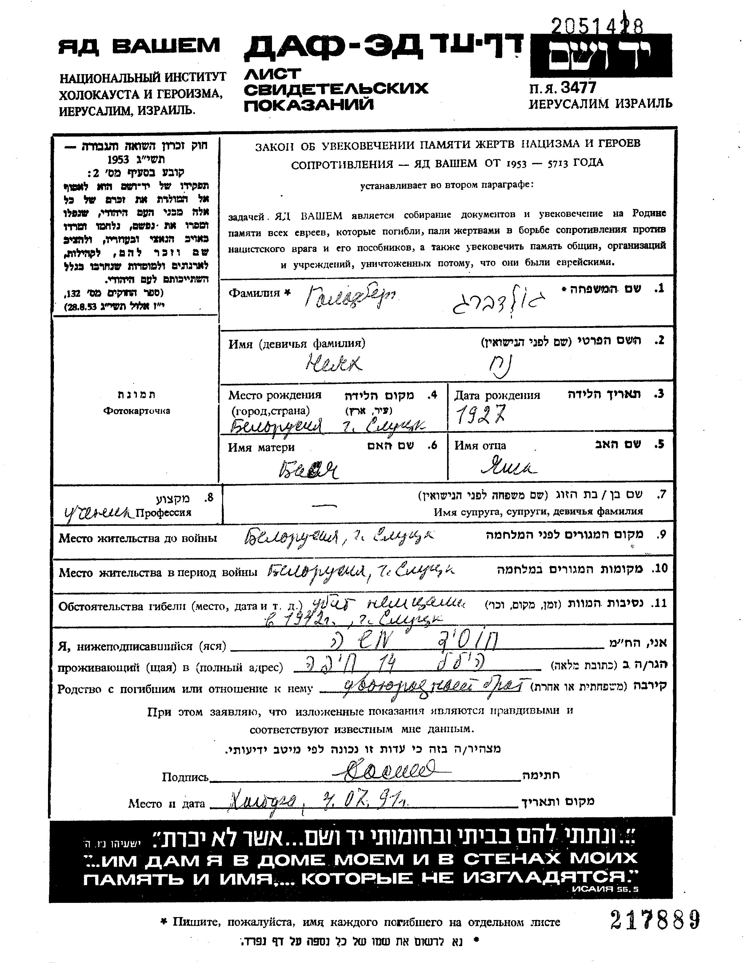 Neiakh wurde in der Schoah ermordet. Todesort: Slutsk, Weißrussland (UdSSR) im Jahr 1942.