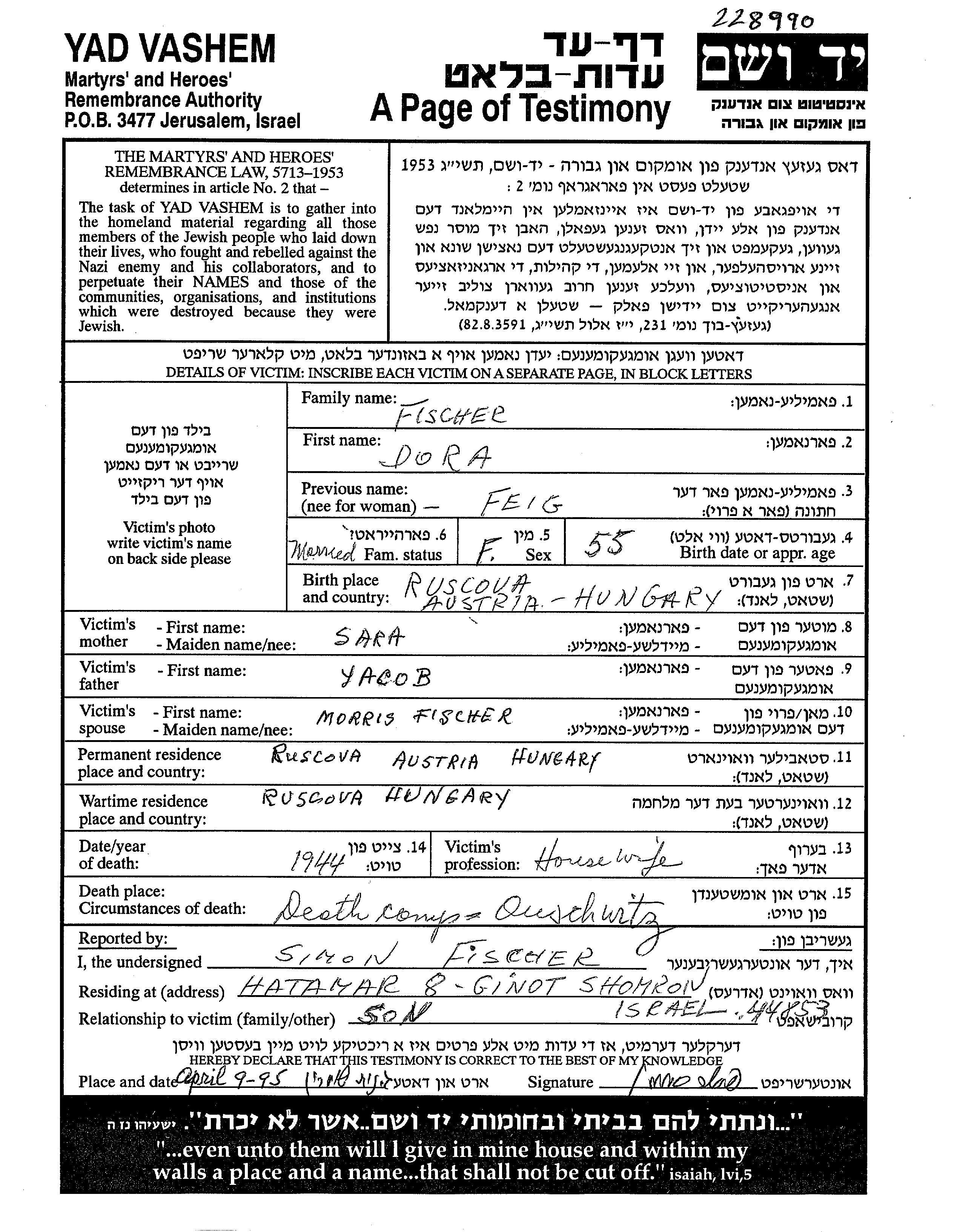Dora Fischer, geb. Feig wurde in Ruscova, Rumänien geboren. Sie war die Tochter von Yacob und Sara. Sie war Hausfrau und mit Morris Verheiratet. Vor dem Zweiten Weltkrieg lebte sie in Ruscova, Rumänien. Während des Krieges war sie in Ruscova, Rumänien.