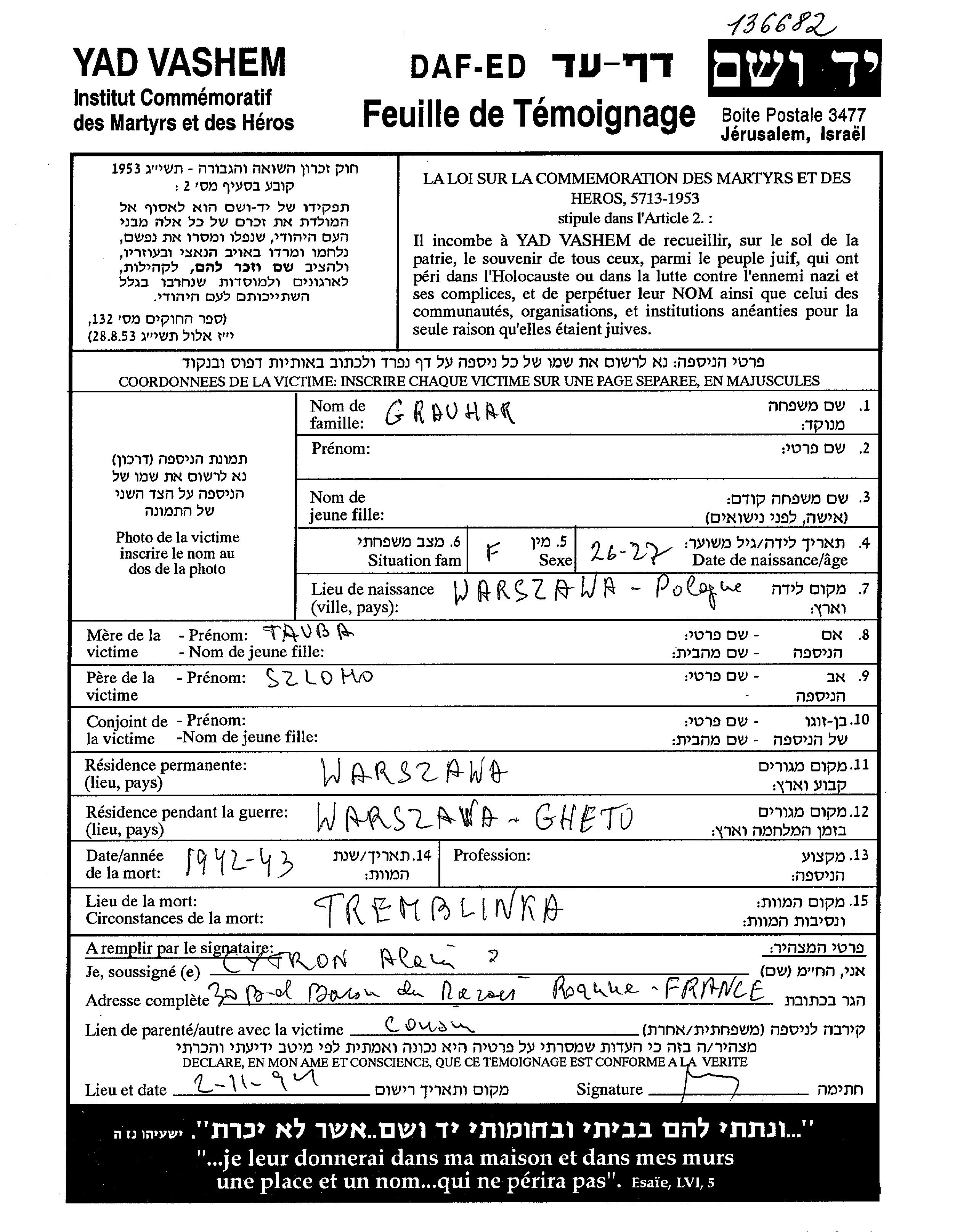 Vorname unbekannt Grauhar wurde im Jahr 1916 in Warszawa, Polen geboren. Sie war die Tochter von Szlomo und Tauba. Vor dem Zweiten Weltkrieg lebte sie in Warszawa, Polen. Während des Krieges war sie in Warszawa, Polen.