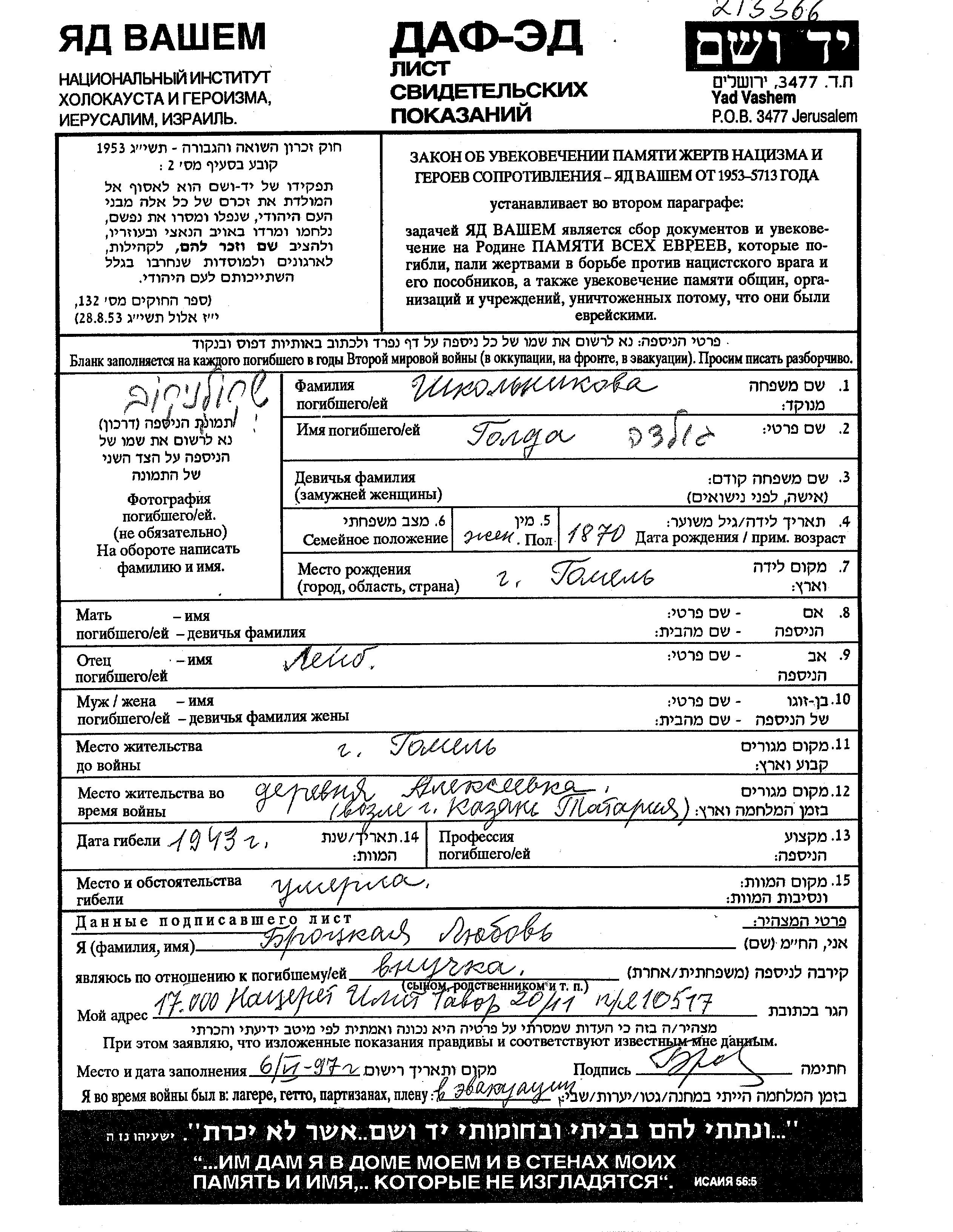 Golda Shkolnikov wurde im Jahr 1870 in Gomel, Weißrussland (UdSSR) geboren. Sie war die Tochter von Leib. Sie war Verheiratet. Vor dem Zweiten Weltkrieg lebte sie in Gomel, Weißrussland (UdSSR). Während des Krieges war sie in Alekseyevskoye, Russland (UdSSR).