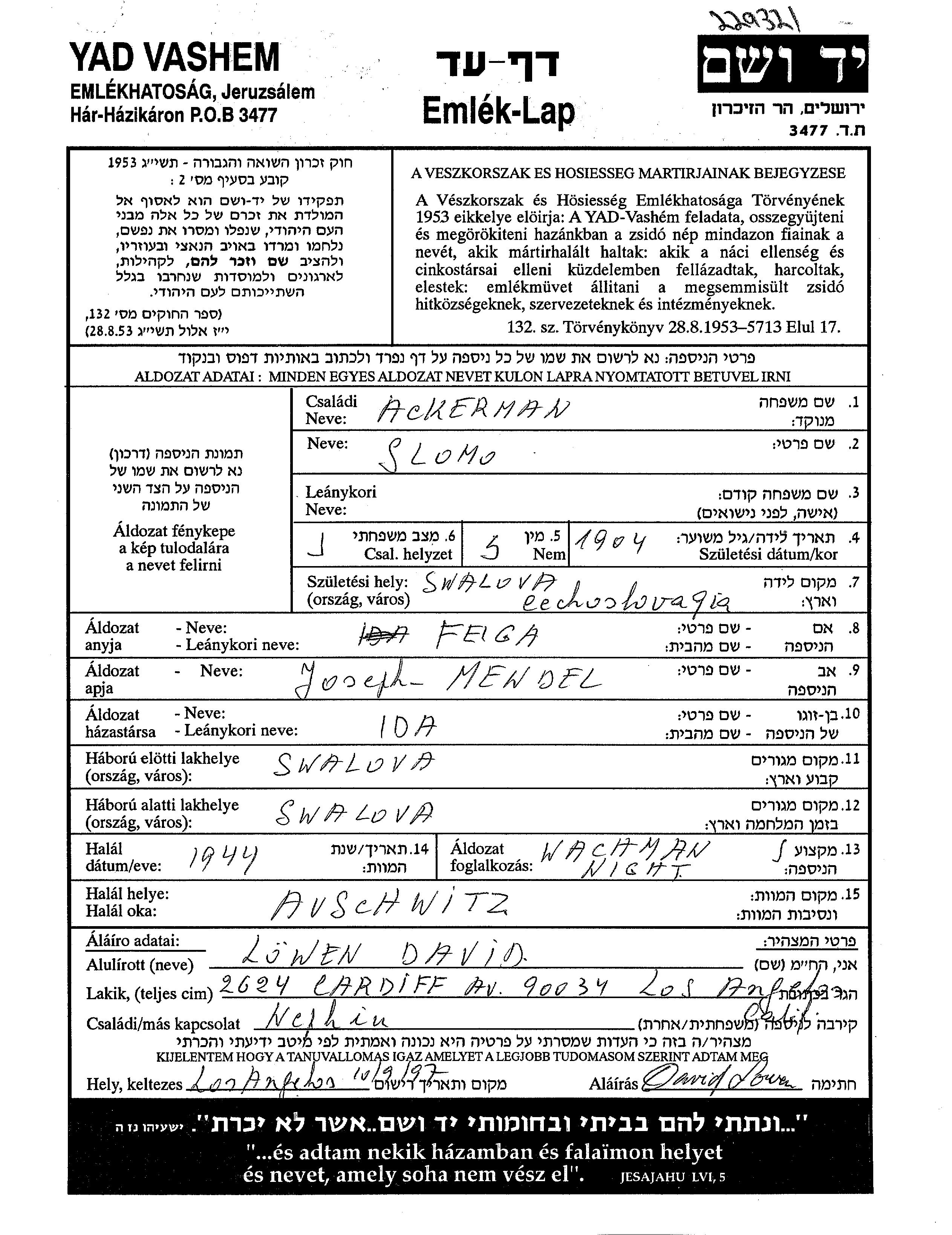 Slomo Ackerman wurde im Jahr 1904 in Svalava, Tschechoslowakei geboren. Er war der Sohn von Joseph Mendel und Feiga. Er war Wachmann und mit Ida Verheiratet. Vor dem Zweiten Weltkrieg lebte er in Svalava, Tschechoslowakei. Während des Krieges war er in Svalava, Tschechoslowakei.