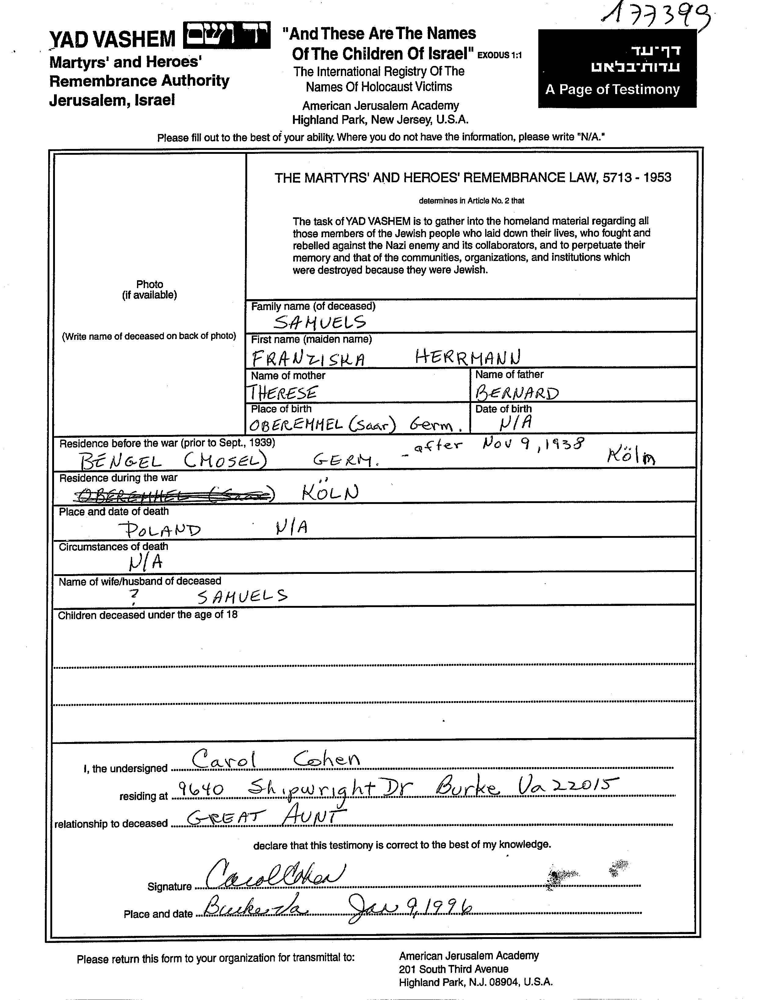 Franziska Samuels, geb. Hermann wurde in Oberemmel, Deutsches Reich geboren. Sie war die Tochter von Bernard und Therese. Sie war Verheiratet. Vor dem Zweiten Weltkrieg lebte sie in Koeln, Deutsches Reich. Während des Krieges war sie in Koeln, Deutsches Reich.