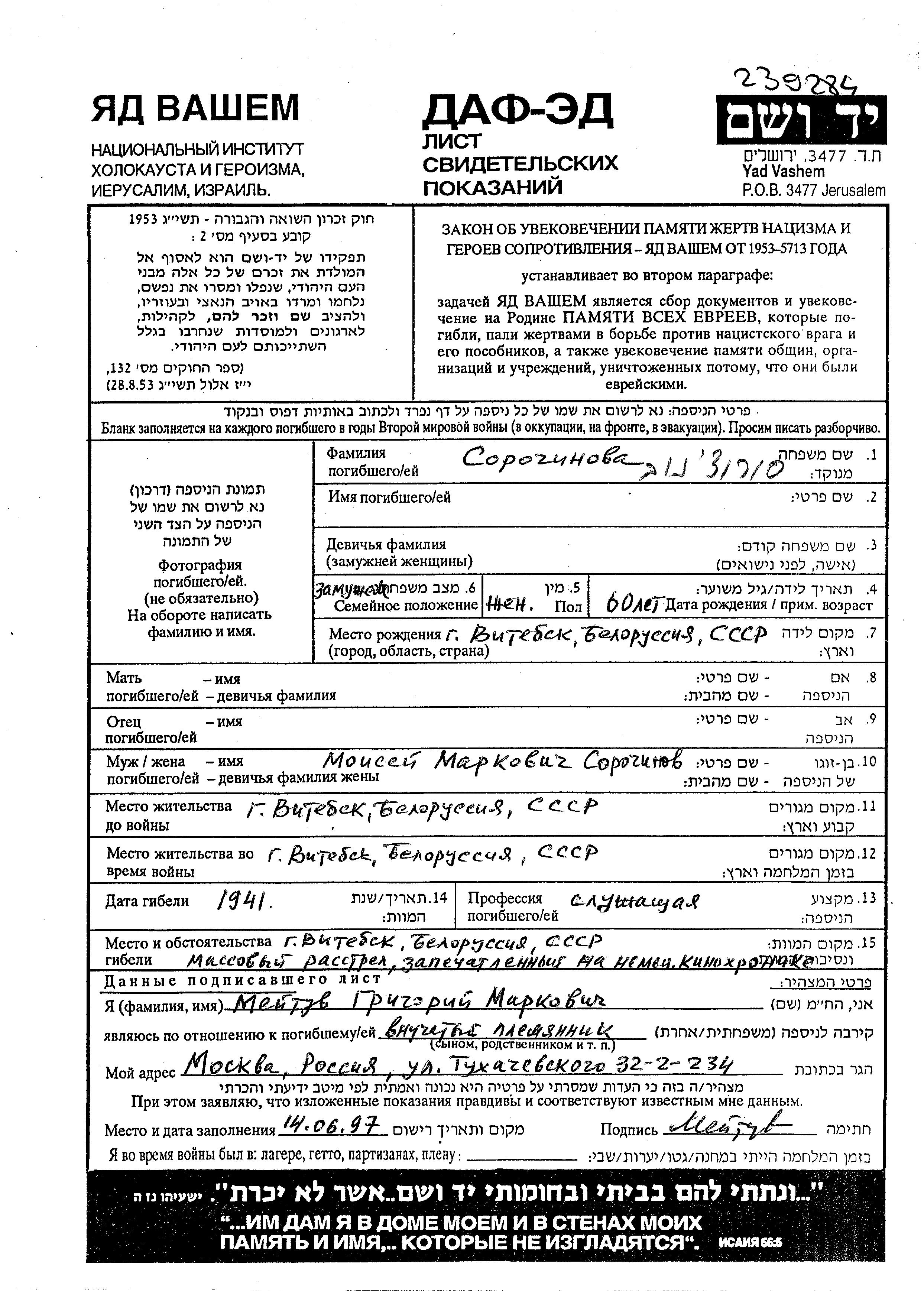 Vorname unbekannt Sorochinova wurde im Jahr 1881 in Vitebsk, Weißrussland (UdSSR) geboren. Sie war Angestellte/-r und mit Moisei Verheiratet. Vor dem Zweiten Weltkrieg lebte sie in Vitebsk, Weißrussland (UdSSR). Während des Krieges war sie in Vitebsk, Weißrussland (UdSSR).