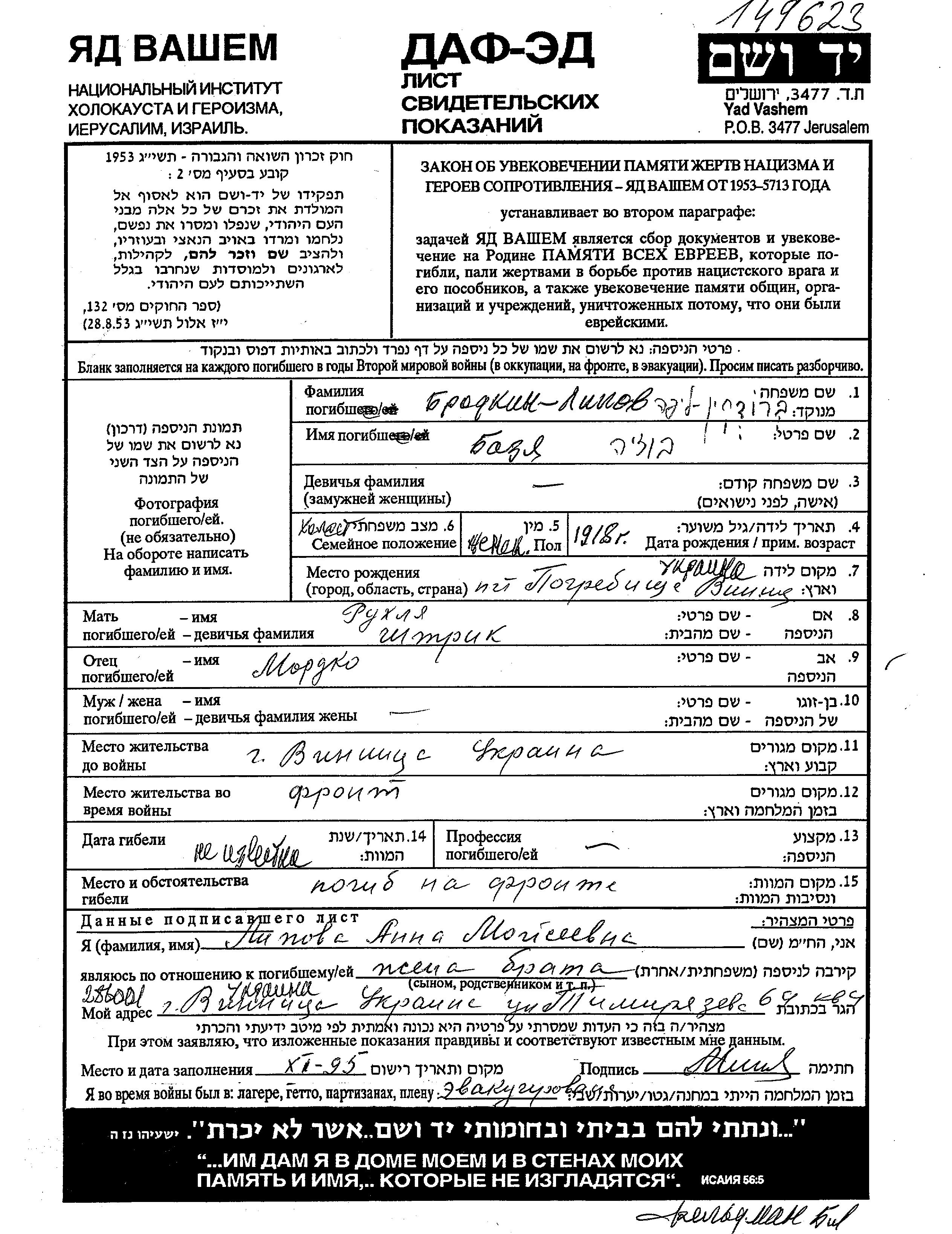 Bazia Brodkin Lipow wurde im Jahr 1918 in Pogrebishche, Ukraine (UdSSR) geboren. Sie war die Tochter von Mordko und Rukhlia, geb. Shtrik. Vor dem Zweiten Weltkrieg lebte sie in Vinnitsa, Ukraine (UdSSR). Während des Krieges war sie in die Sowjetischen Streitkräfte.