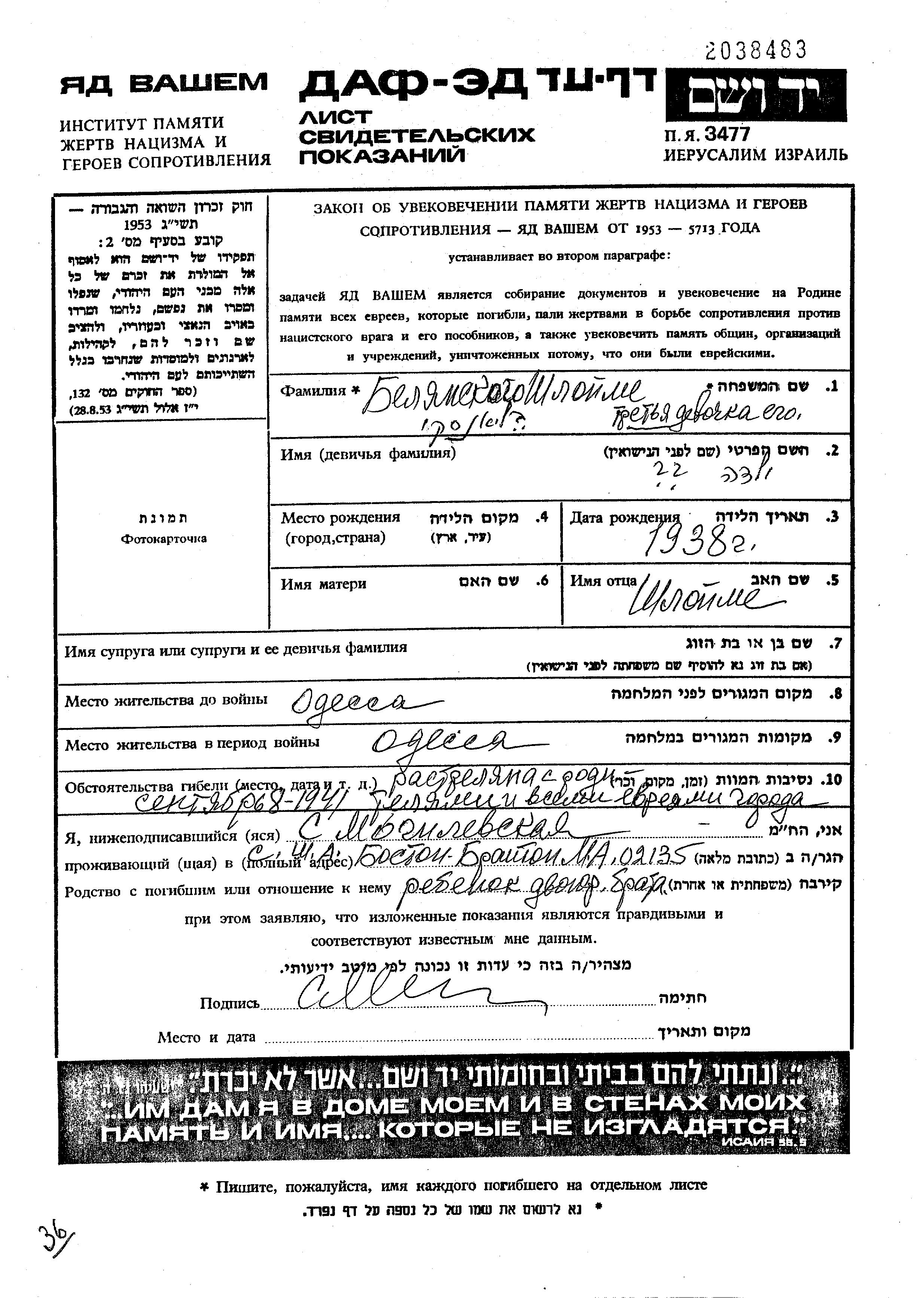Vorname unbekannt Belyanski wurde im Jahr 1938 in Odessa, Ukraine (UdSSR) geboren. Sie war die Tochter von Shlojmo. Sie war Kind. Vor dem Zweiten Weltkrieg lebte sie in Odessa, Ukraine (UdSSR). Während des Krieges war sie in Odessa, Ukraine (UdSSR).