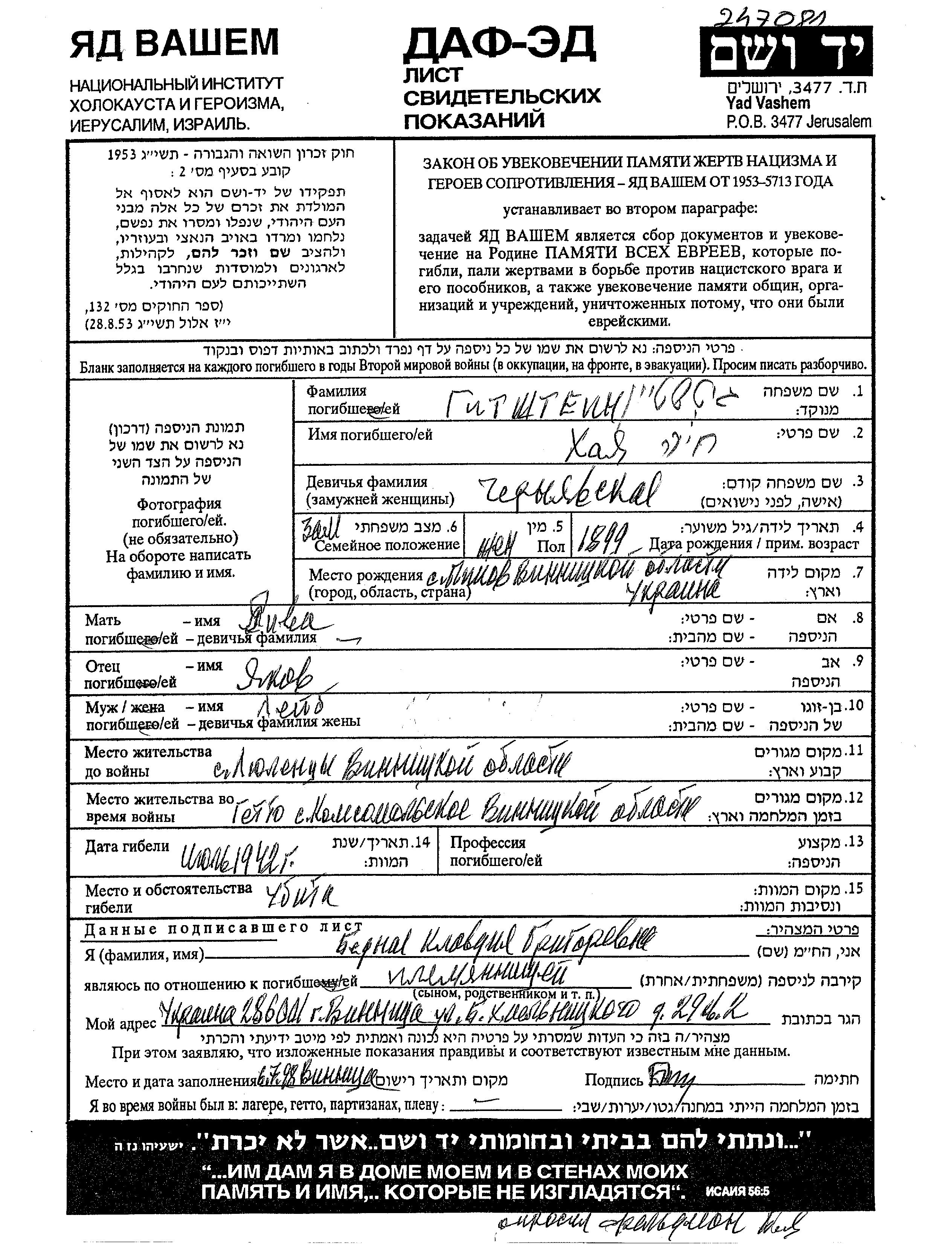 Gitshtein Khaia 1899 Lyulintsy, Ukraine (UdSSR) Gedenkblatt
