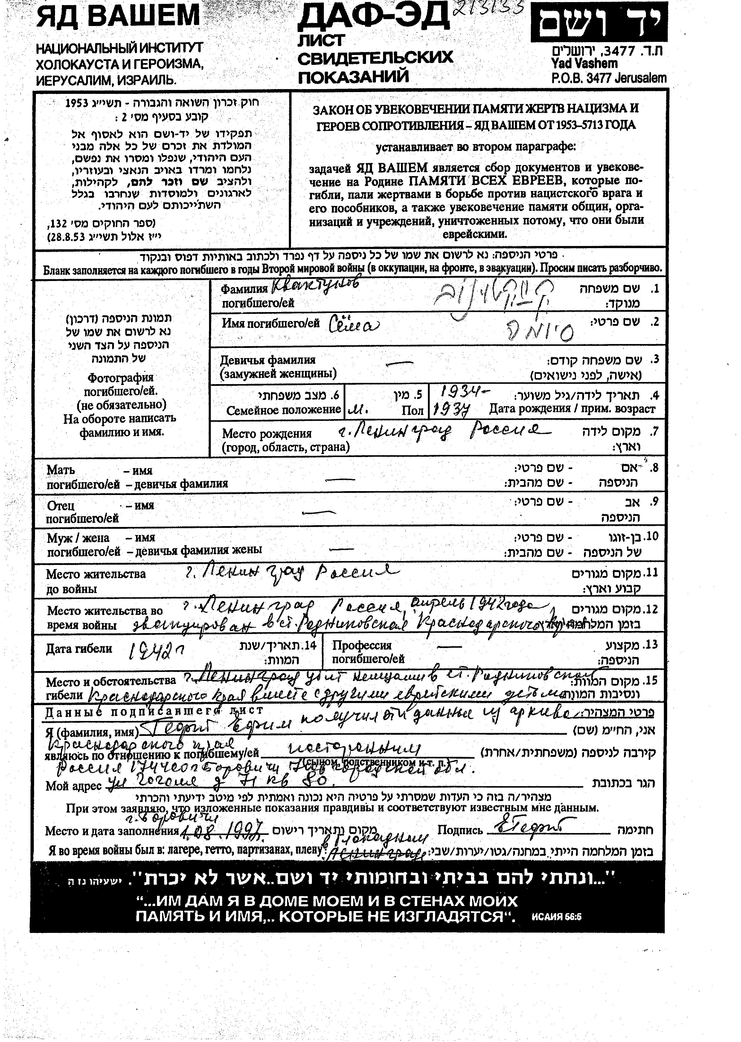Kvaktukov Syoma 1934 Leningrad, Russland (UdSSR) Gedenkblatt