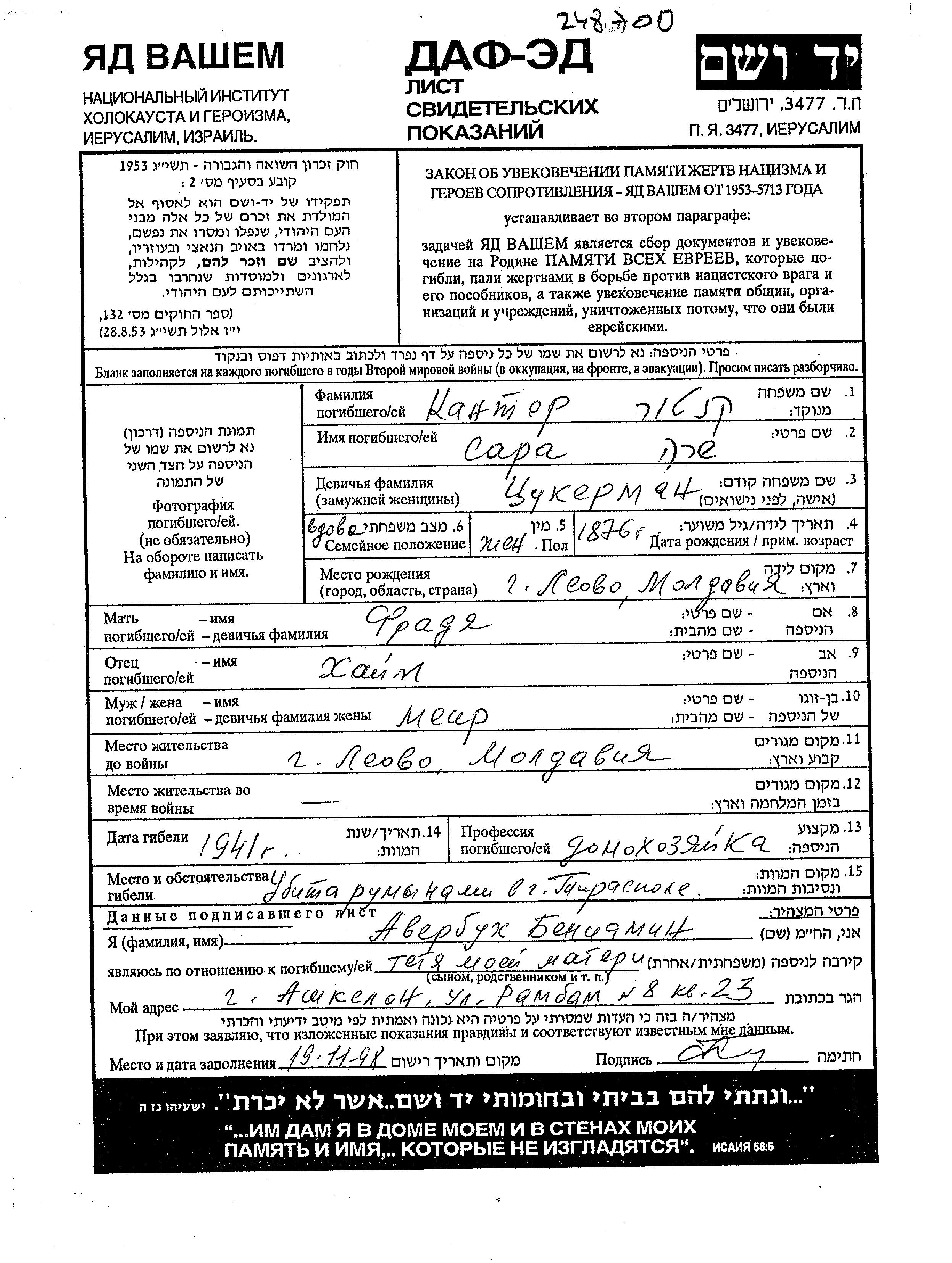 Sara Kantor, geb. Tzukerman wurde im Jahr 1876 in Leova, Rumänien geboren. Sie war die Tochter von Khaim und Fradya. Sie war Hausfrau und mit Meir Verwitwet. Vor dem Zweiten Weltkrieg lebte sie in Leova, Rumänien.