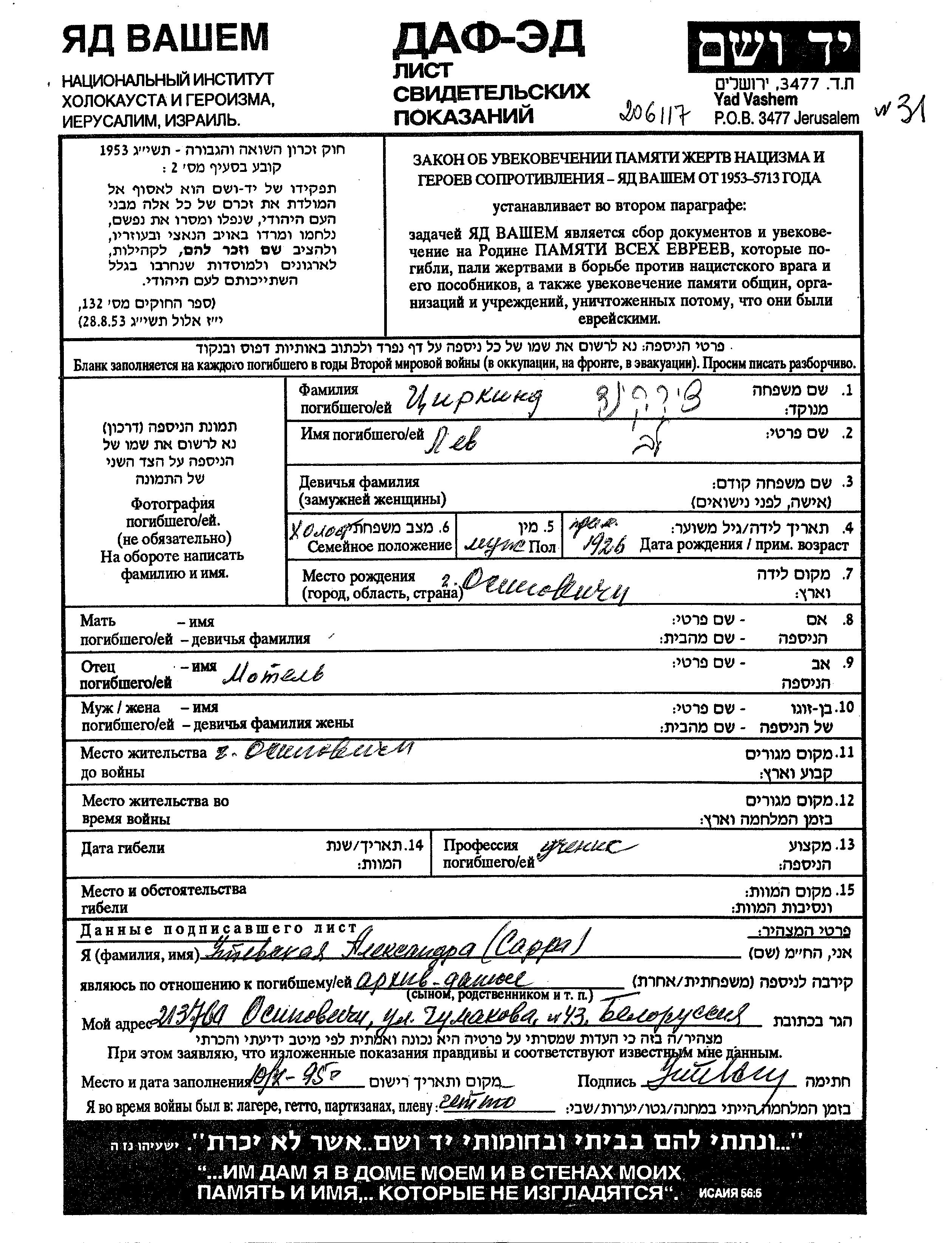 Tzirkind Lev 1926 Osipovichi, Weißrussland (UdSSR) Gedenkblatt