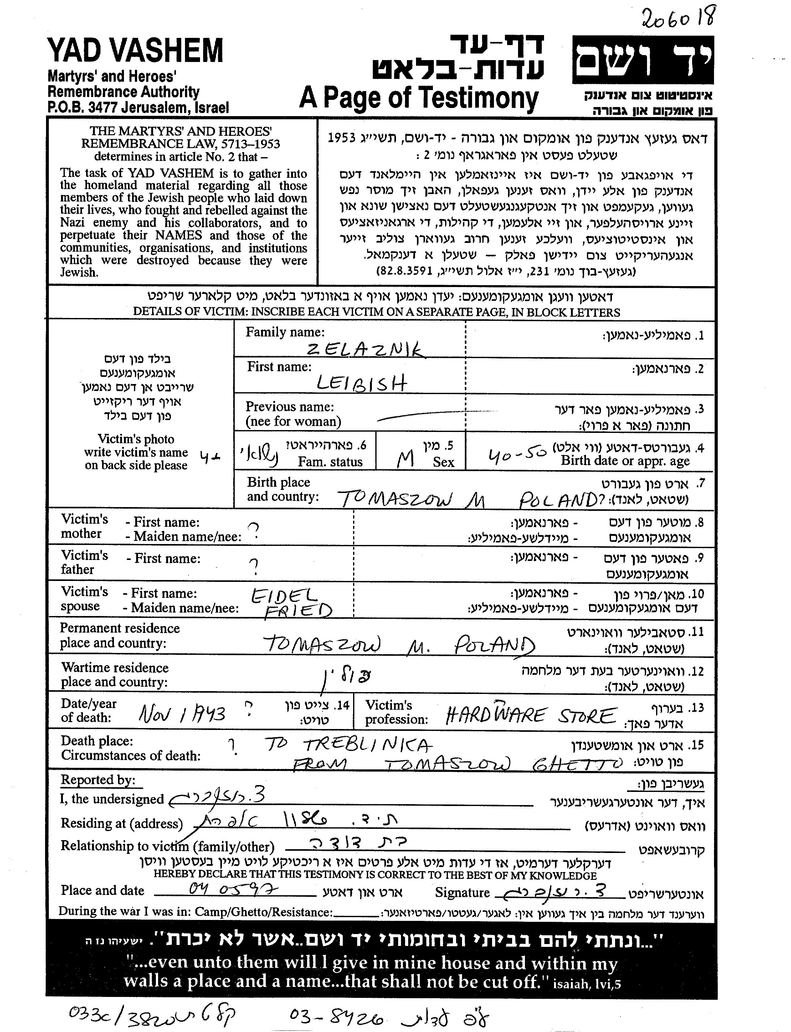 Leibish Zelaznik wurde in Tomaszow Mazowiecki, Polen geboren. Er war Ladenbesitzer/-in und mit Eidel Idl Verheiratet. Vor dem Zweiten Weltkrieg lebte er in Tomaszow Mazowiecki, Polen. Während des Krieges war er in Tomaszow Mazowiecki, Polen.