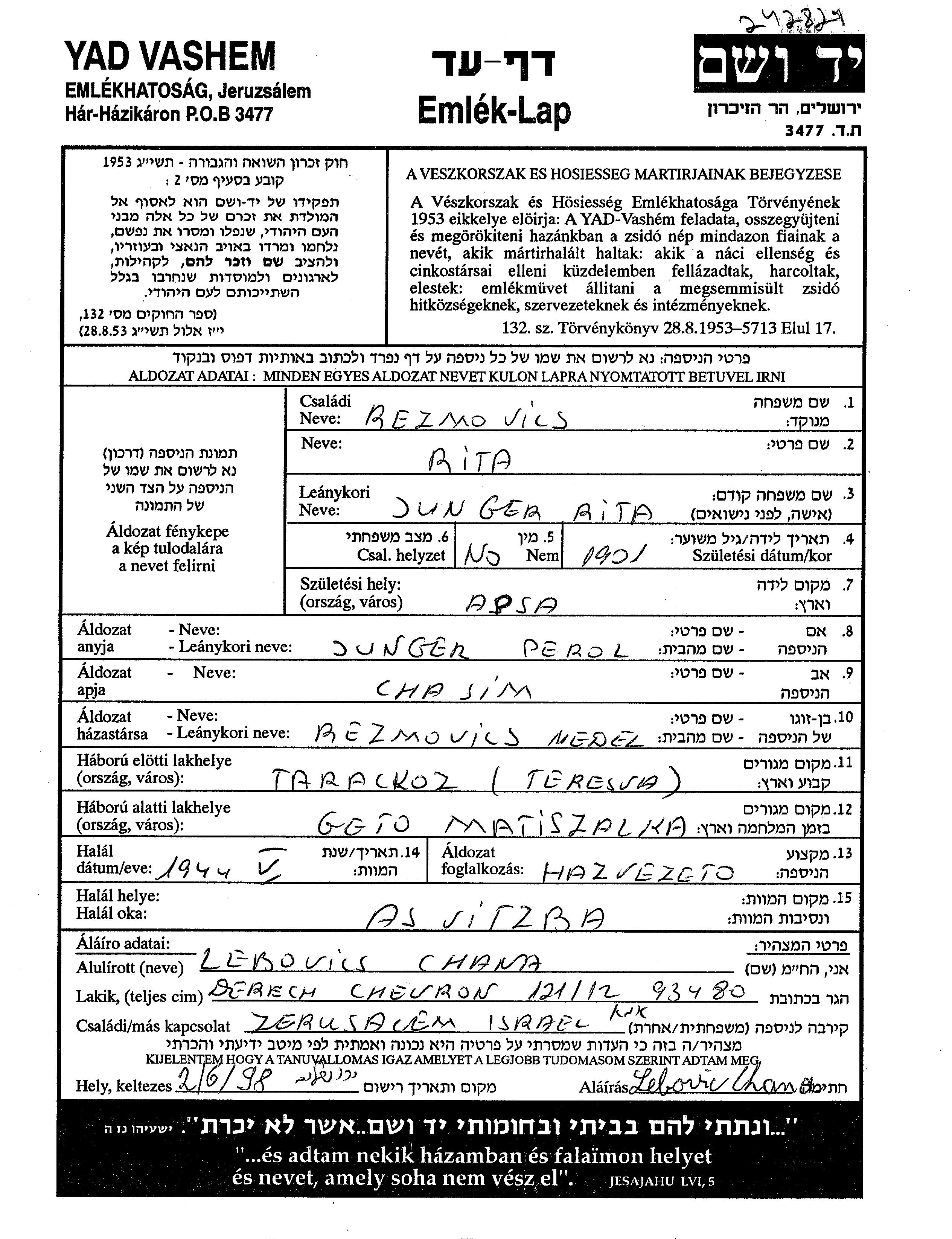 Rita Reizmovics, geb. Junger wurde im Jahr 1901 in Apsa, Tschechoslowakei geboren. Sie war die Tochter von Chaim und Perol, geb. Junger. Sie war Hausfrau und mit Mendel Verheiratet. Vor dem Zweiten Weltkrieg lebte sie in Tarackoz, Tschechoslowakei. Während des Krieges war sie in Mateszalka, Ungarn.