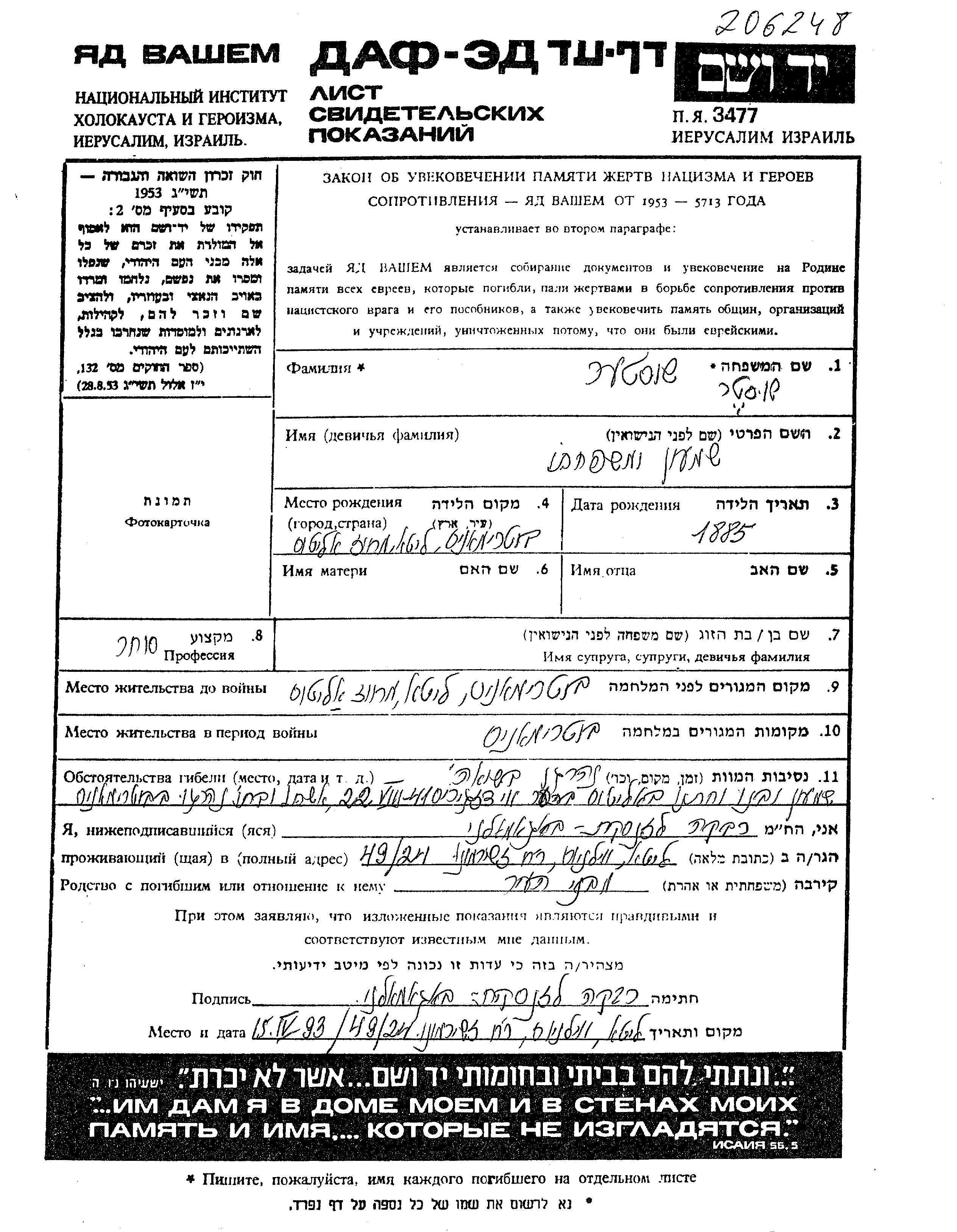 Shimon wurde in der Schoah ermordet. Todesort: Alitus, Litauen im Jahr 22/08/1941.