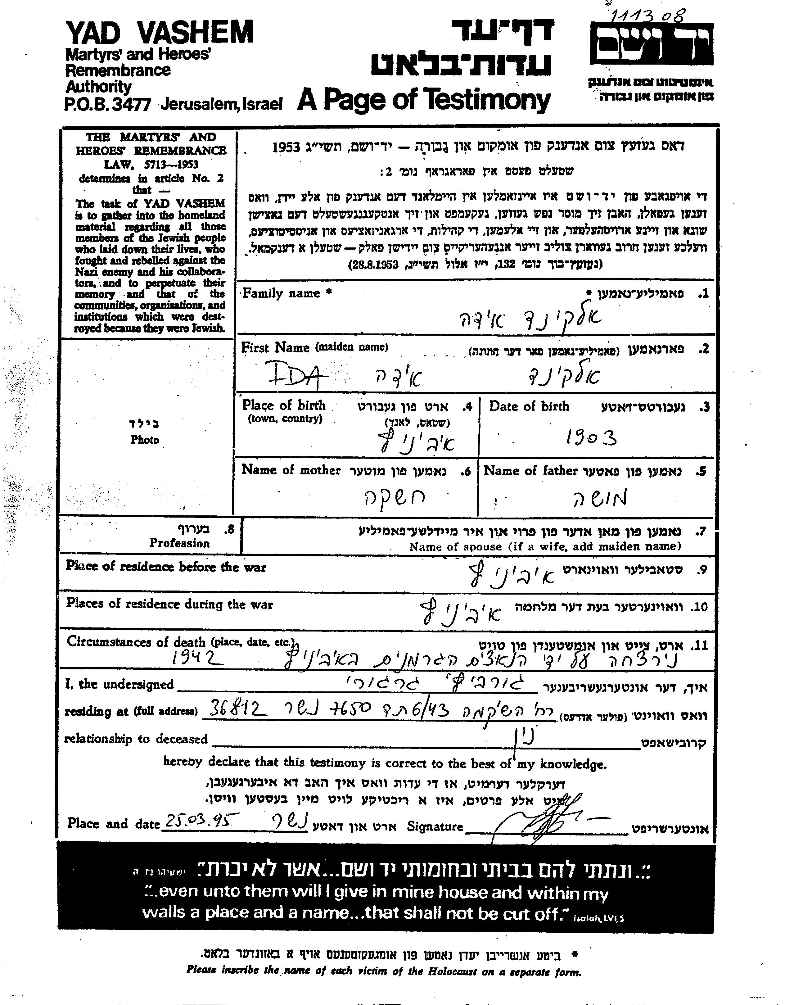 Ida Elkind wurde im Jahr 1903 in Ivenets, Polen geboren. Sie war die Tochter von Moshe und Khashka Khashka. Vor dem Zweiten Weltkrieg lebte sie in Ivenets, Polen. Während des Krieges war sie in Ivenets, Polen.