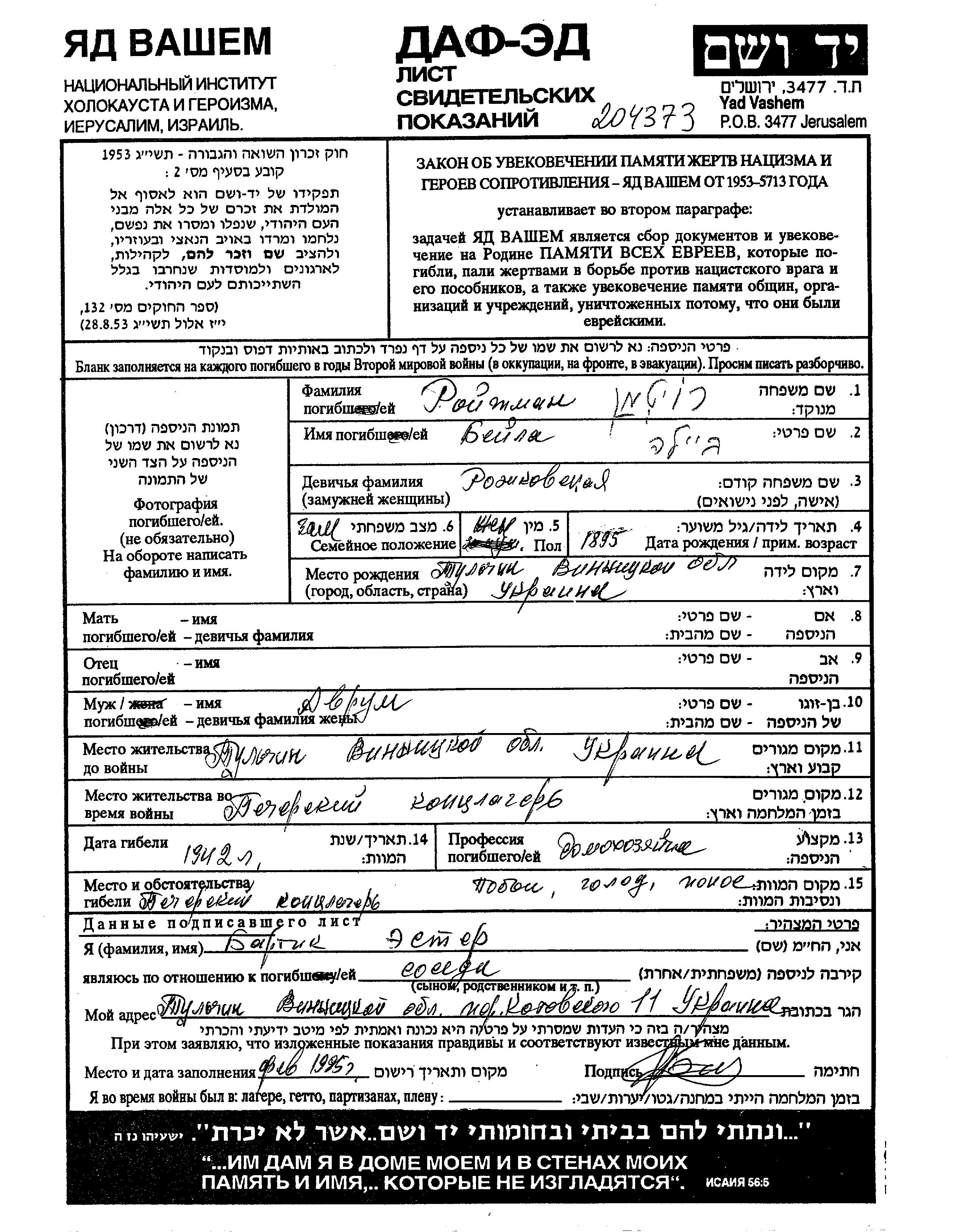 Roitman Beila 1895 Tulchin, Ukraine (UdSSR) Gedenkblatt