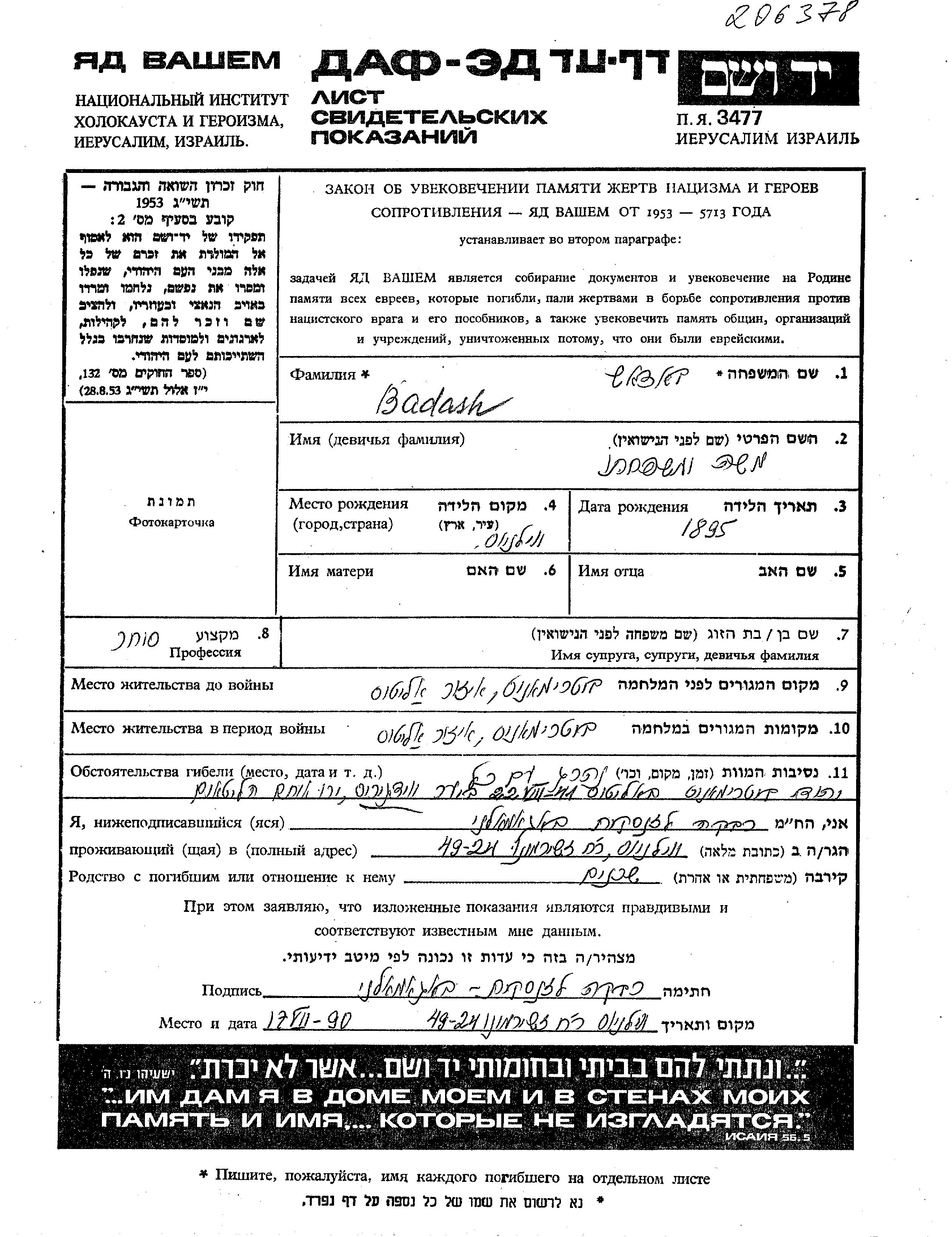 Moshe Badash wurde im Jahr 1895 in Vilnius, Polen geboren. Er war Kaufmann/-frau. Vor dem Zweiten Weltkrieg lebte er in Butrimonys, Litauen. Während des Krieges war er in Butrimonys, Litauen.