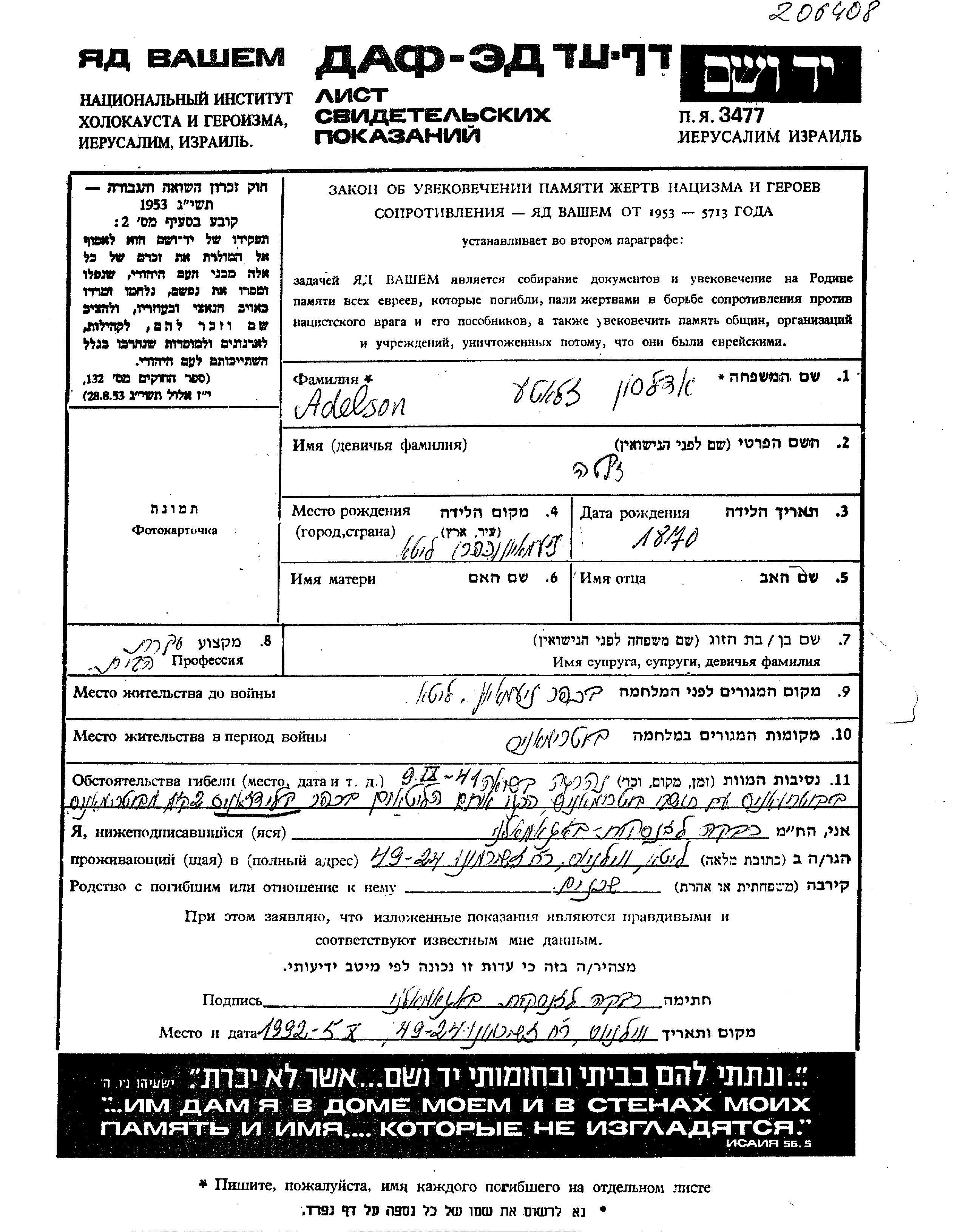 Zlata Adelson wurde im Jahr 1870 in Litauen geboren. Sie war Hausfrau. Vor dem Zweiten Weltkrieg lebte sie in Litauen. Während des Krieges war sie in Butrimonys, Litauen.