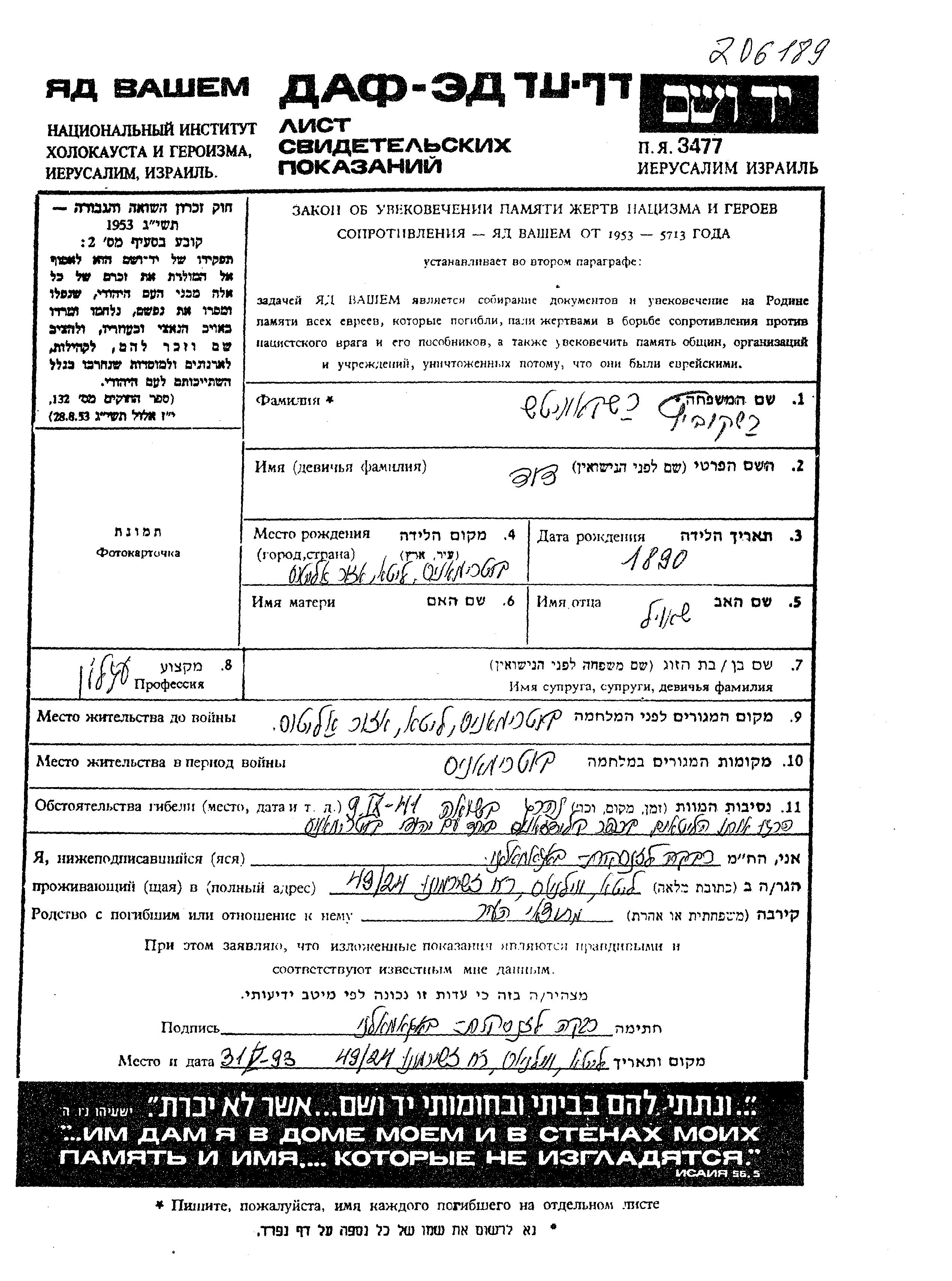Rashkovich David 1890 Butrimonys, Litauen Gedenkblatt