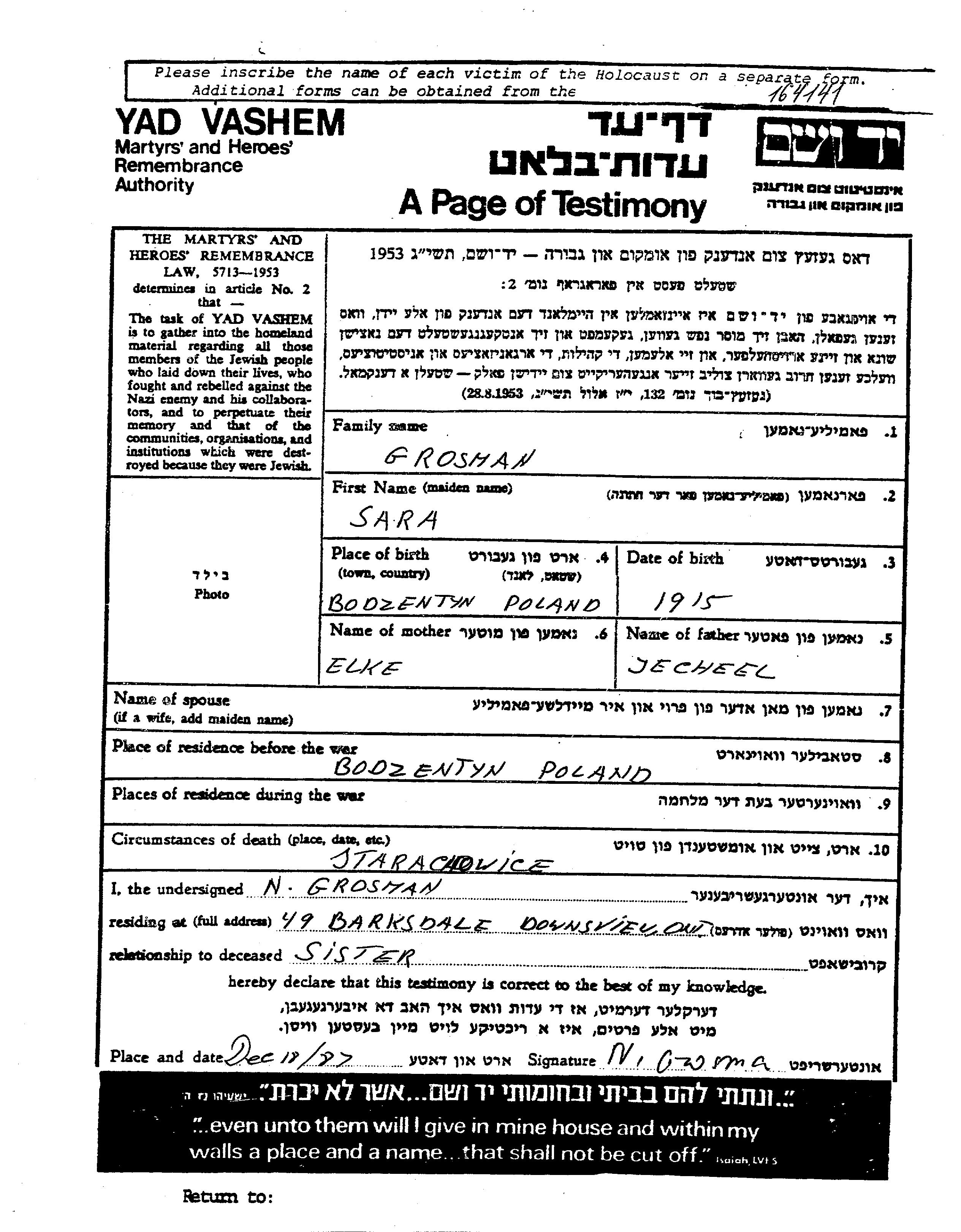 Grosman Sara 1915 Bodzentyn, Polen Gedenkblatt