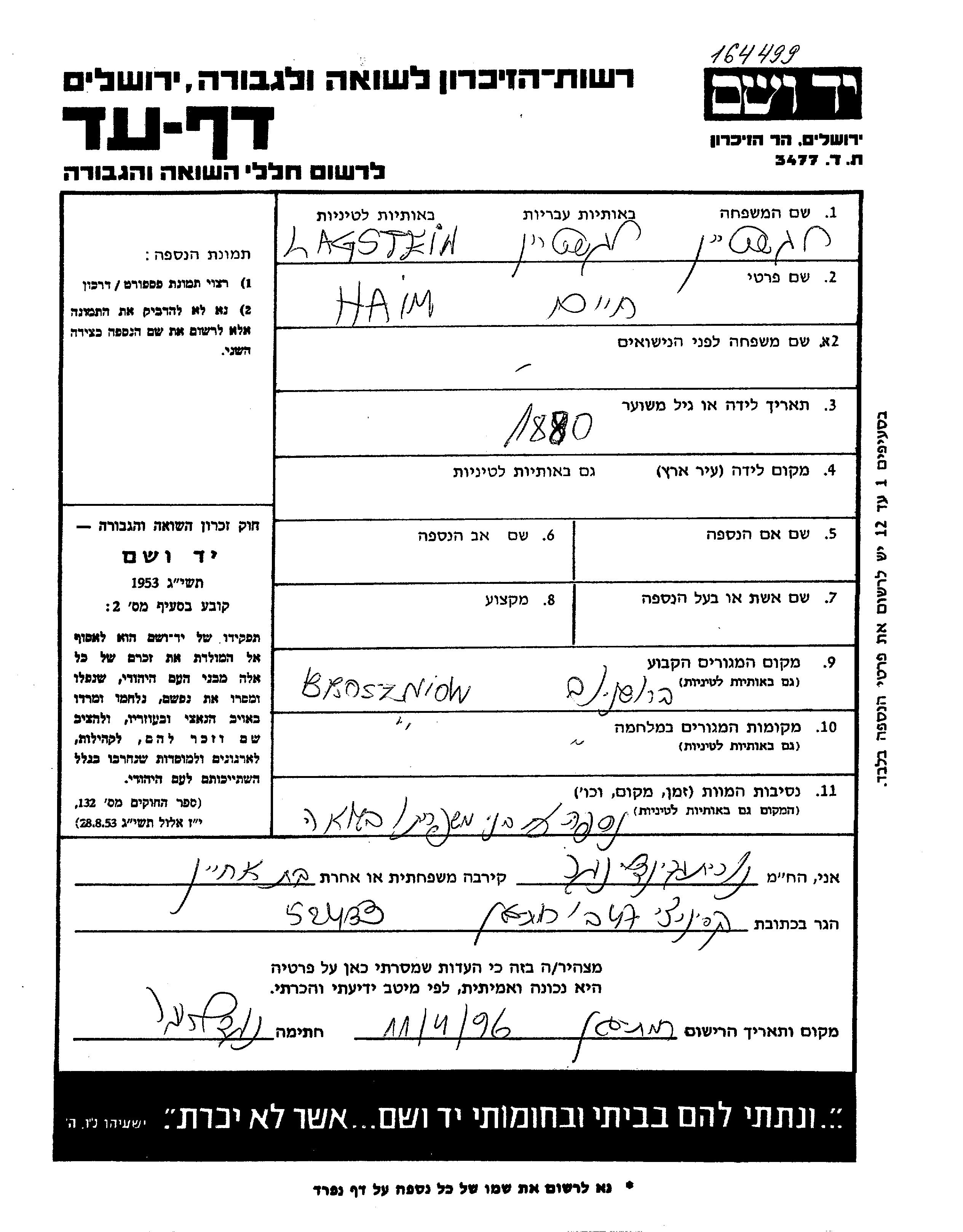 Haim Lagstein wurde im Jahr 1880 geboren. Er war mit Ernestina Verheiratet. Vor dem Zweiten Weltkrieg lebte er in Broszniow, Polen. Während des Krieges war er in Broszniow, Polen.