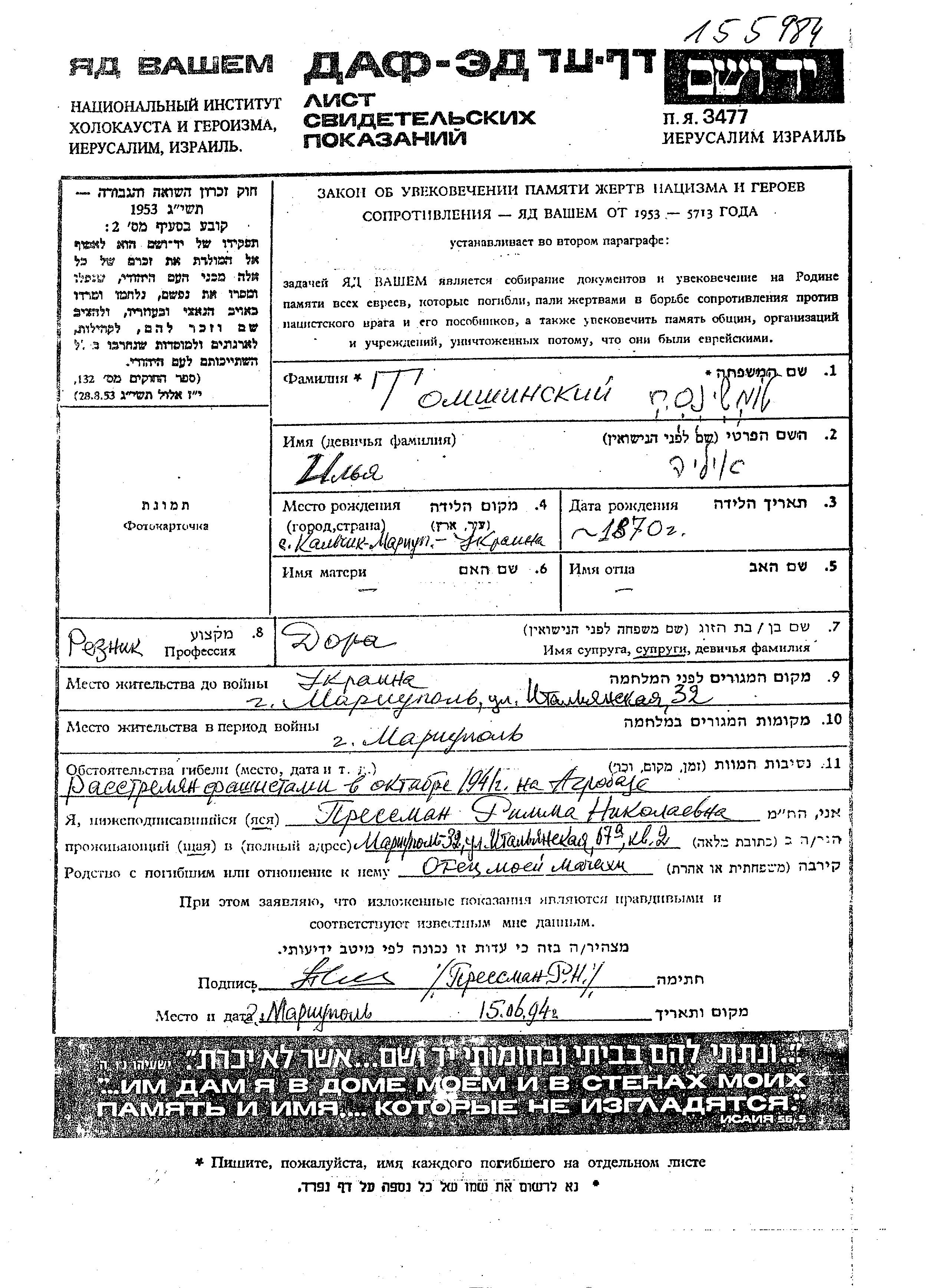 Ilia Tomshinski wurde im Jahr 1870 in Kalchik, Ukraine (UdSSR) geboren. Er war Schächter und mit Dora Verheiratet. Vor dem Zweiten Weltkrieg lebte er in Mariupol, Ukraine (UdSSR). Während des Krieges war er in Mariupol, Ukraine (UdSSR).
