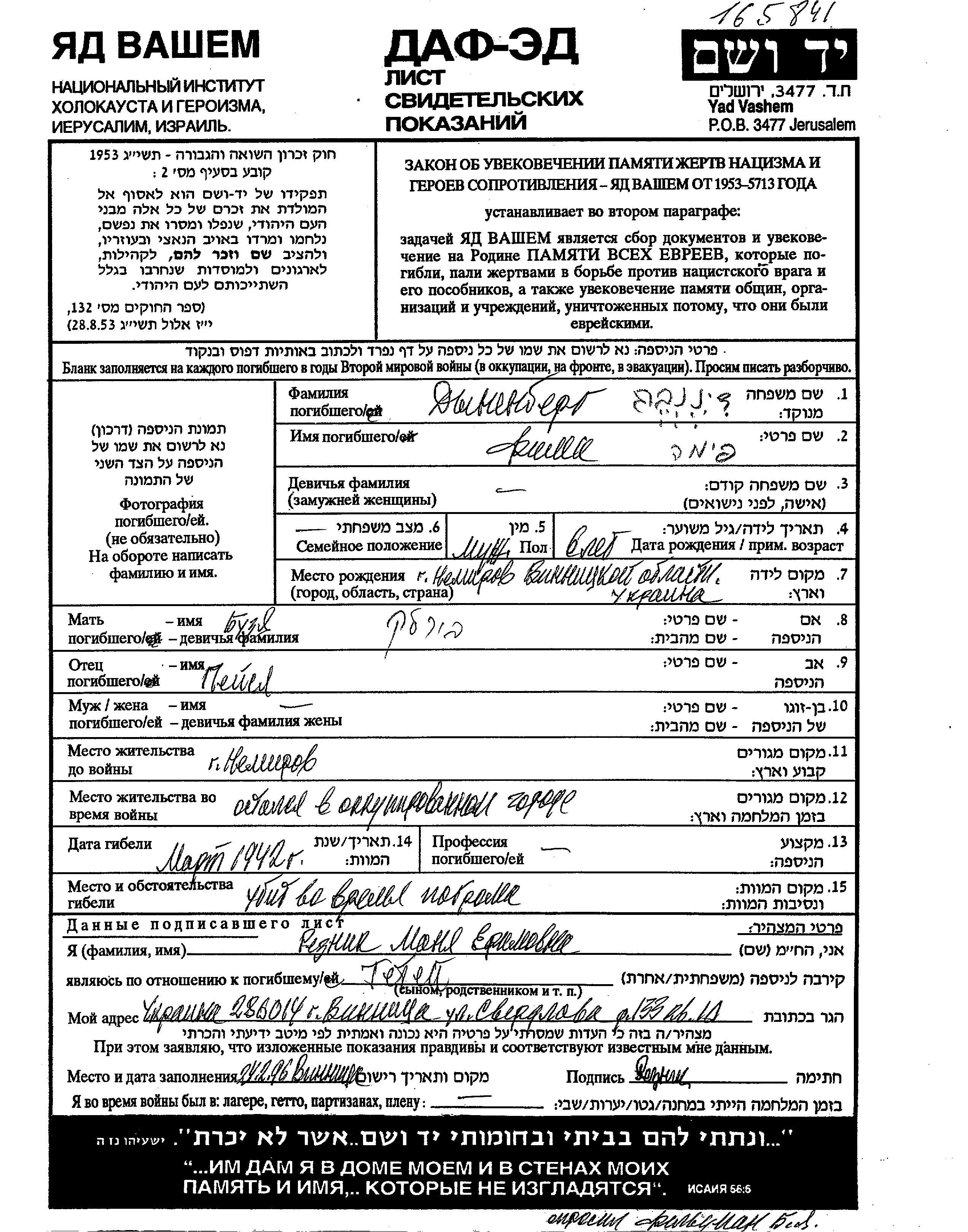 Fima wurde in der Schoah ermordet. Todesort: Nemirov, Ukraine (UdSSR) im Jahr 1942.