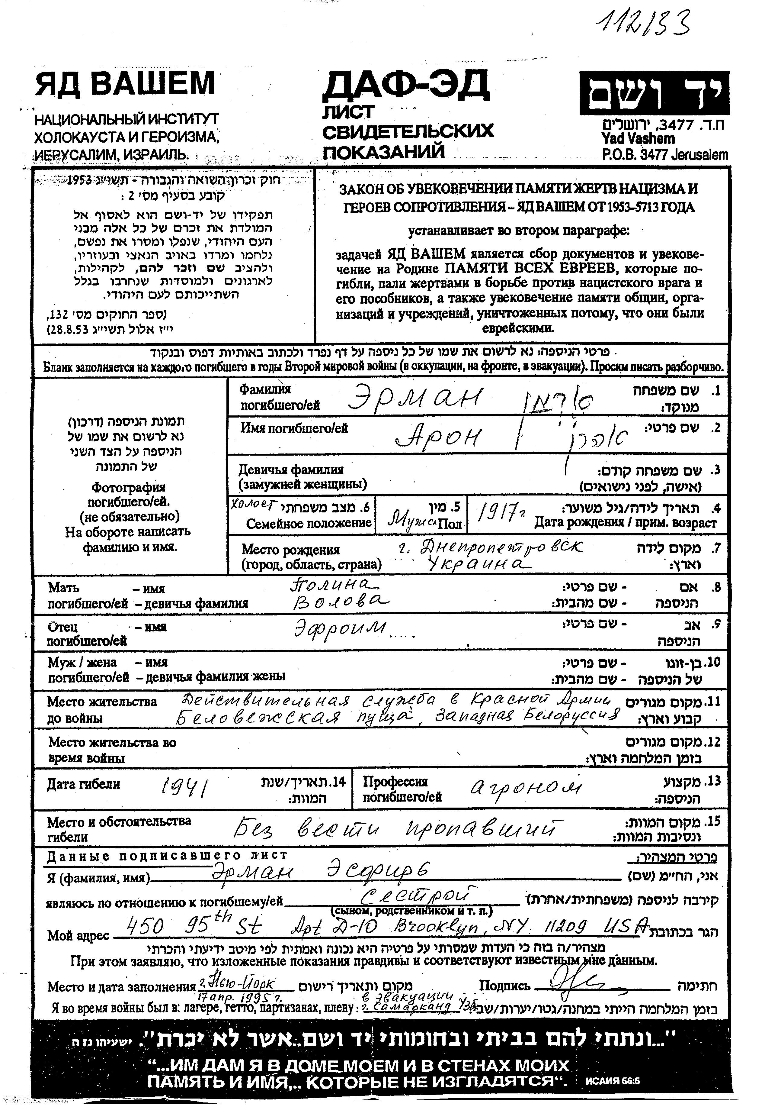 Aron Arman Erman wurde im Jahr 1917 in Dnepropetrovsk, Ukraine (UdSSR) geboren. Er war der Sohn von Efroim und Polina, geb. Volov. Er war Studierter landwirt und Ledig. Während des Krieges war er in die Sowjetischen Streitkräfte.