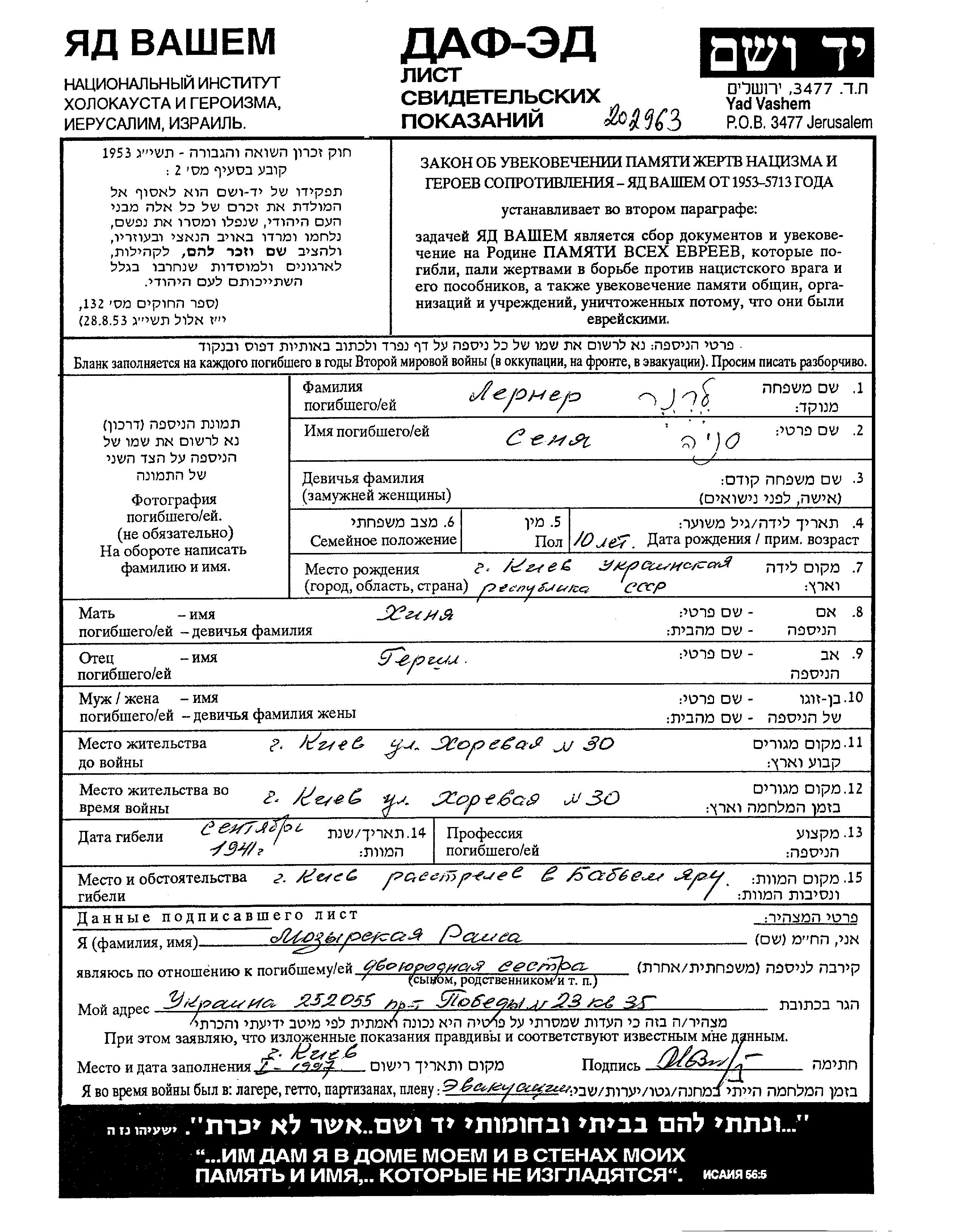 Lyova Liuba wurde in der Schoah ermordet. Todesort: Babi Yar, Ukraine (UdSSR) im Jahr 1941.