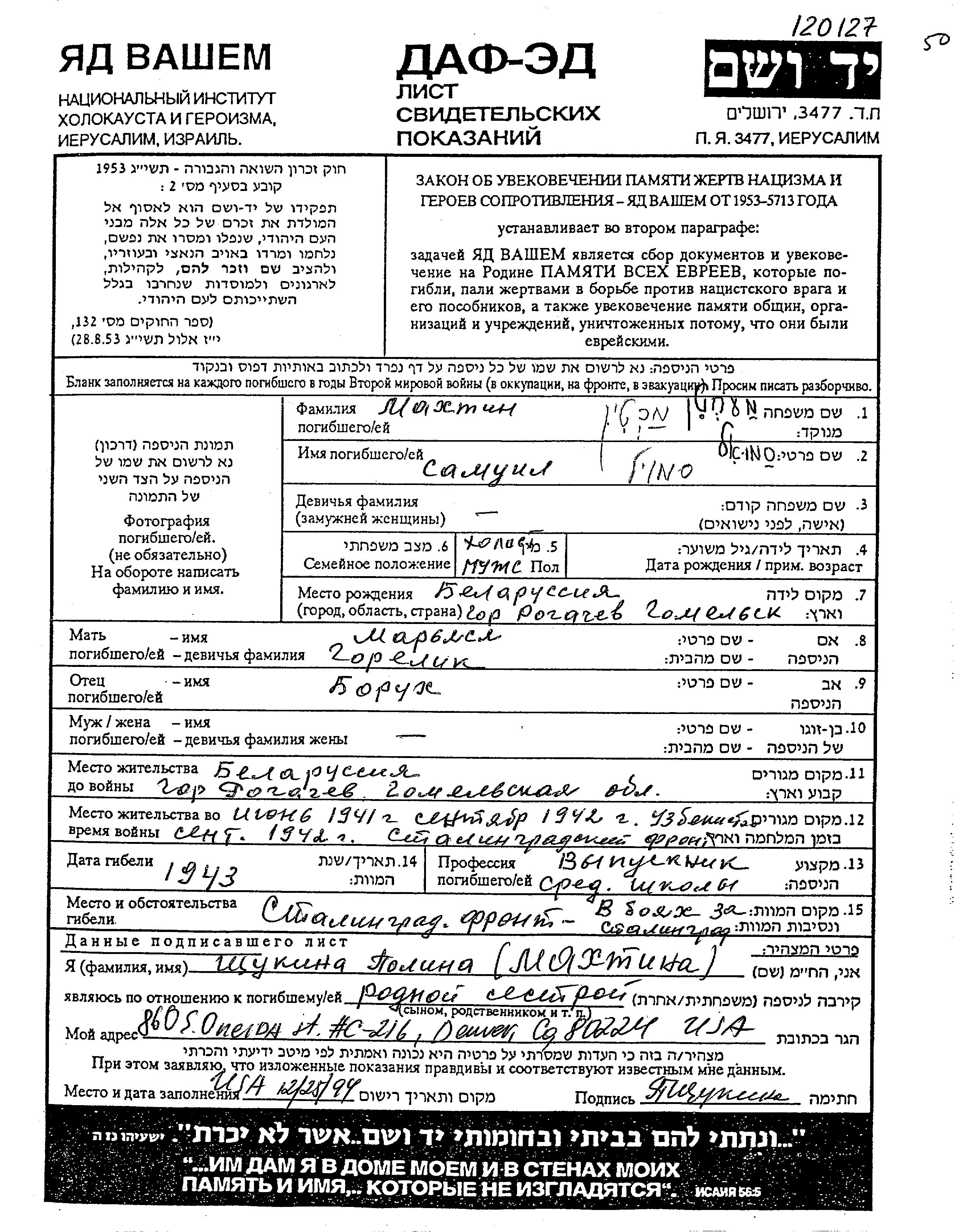 Samuil Makhtin wurde in Rogachev, Weißrussland (UdSSR) geboren. Er war der Sohn von Barukh und Maryasia, geb. Gorelik. Er war Ledig. Vor dem Zweiten Weltkrieg lebte er in Rogachev, Weißrussland (UdSSR). Während des Krieges war er in die Sowjetischen Streitkräfte. Samuil im Militärdienst umgekommen. Todesort: Stalingrad, Russland (UdSSR) im Jahr 1943.