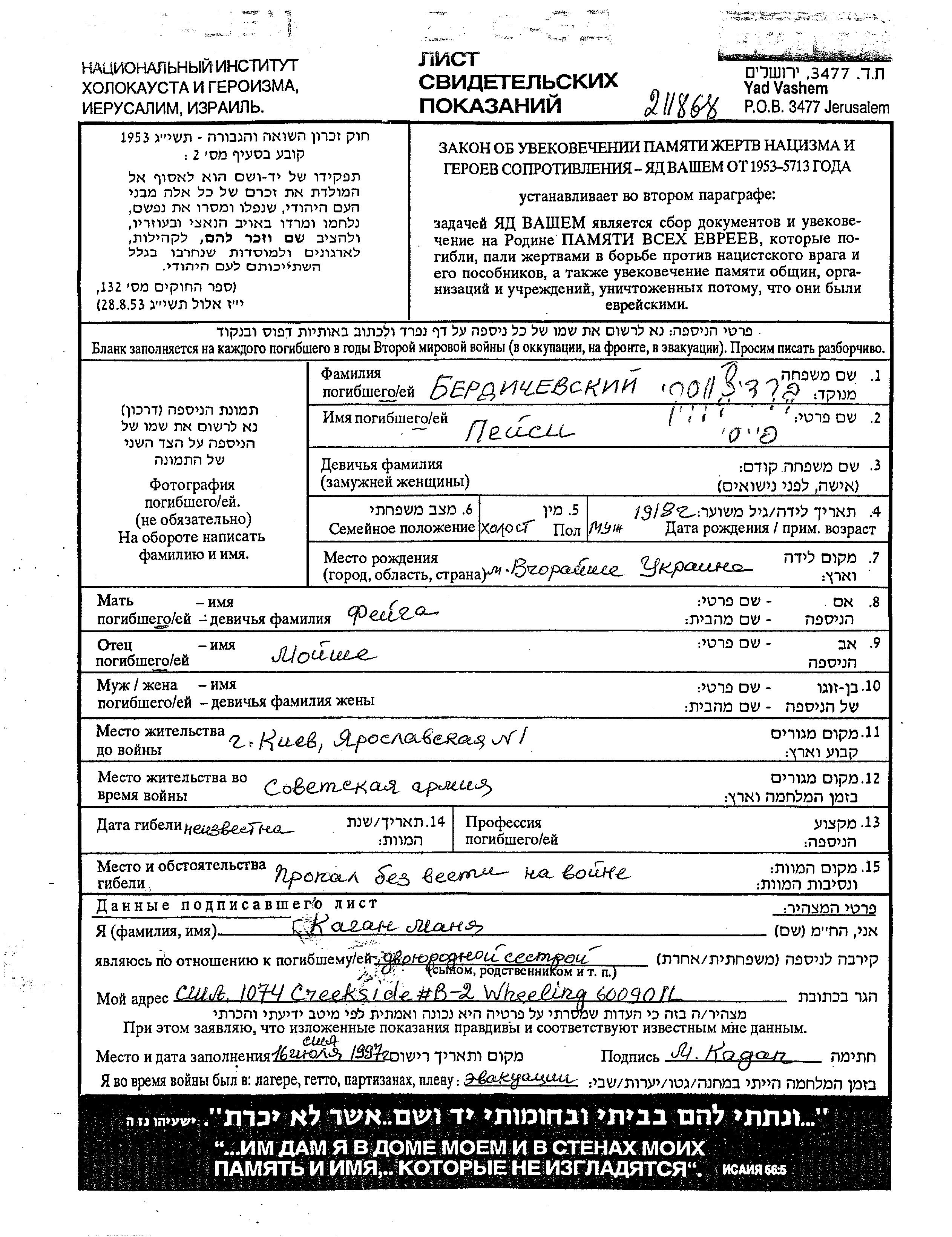 Peisi Berdichevski wurde im Jahr 1918 in Vcherayshe, Ukraine (UdSSR) geboren. Er war der Sohn von Moishe und Feiga. Er war Ledig. Vor dem Zweiten Weltkrieg lebte er in Kiyev, Ukraine (UdSSR). Während des Krieges war er in die Sowjetischen Streitkräfte.