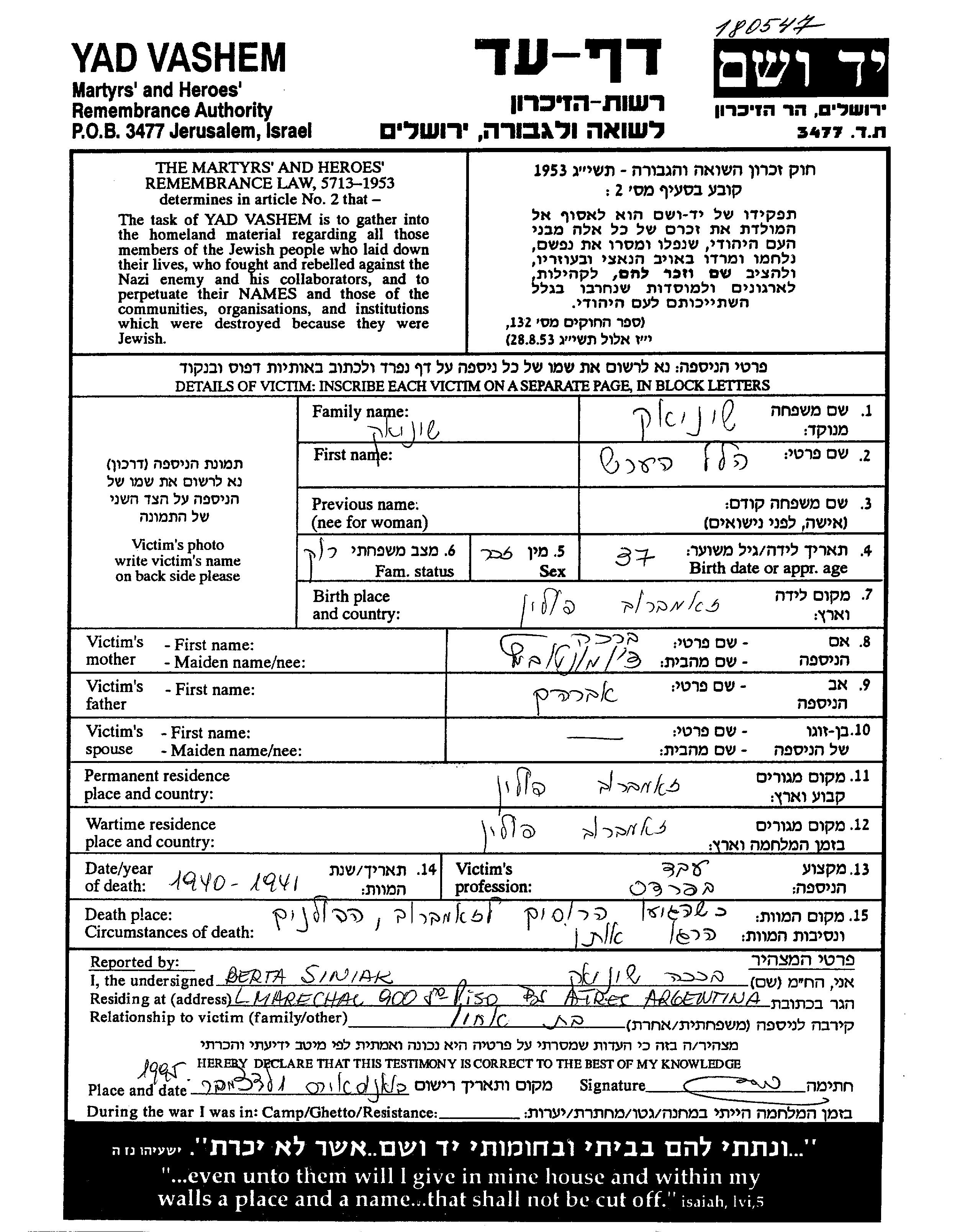 Hersh Hilel Siniak wurde im Jahr 1903 in Zambrow, Polen geboren. Er war der Sohn von Avraham und Brakha, geb. Diomontovich Khomentovitz. Er war Landwirt und Ledig. Vor dem Zweiten Weltkrieg lebte er in Zambrow, Polen. Während des Krieges war er in Zambrow, Polen.