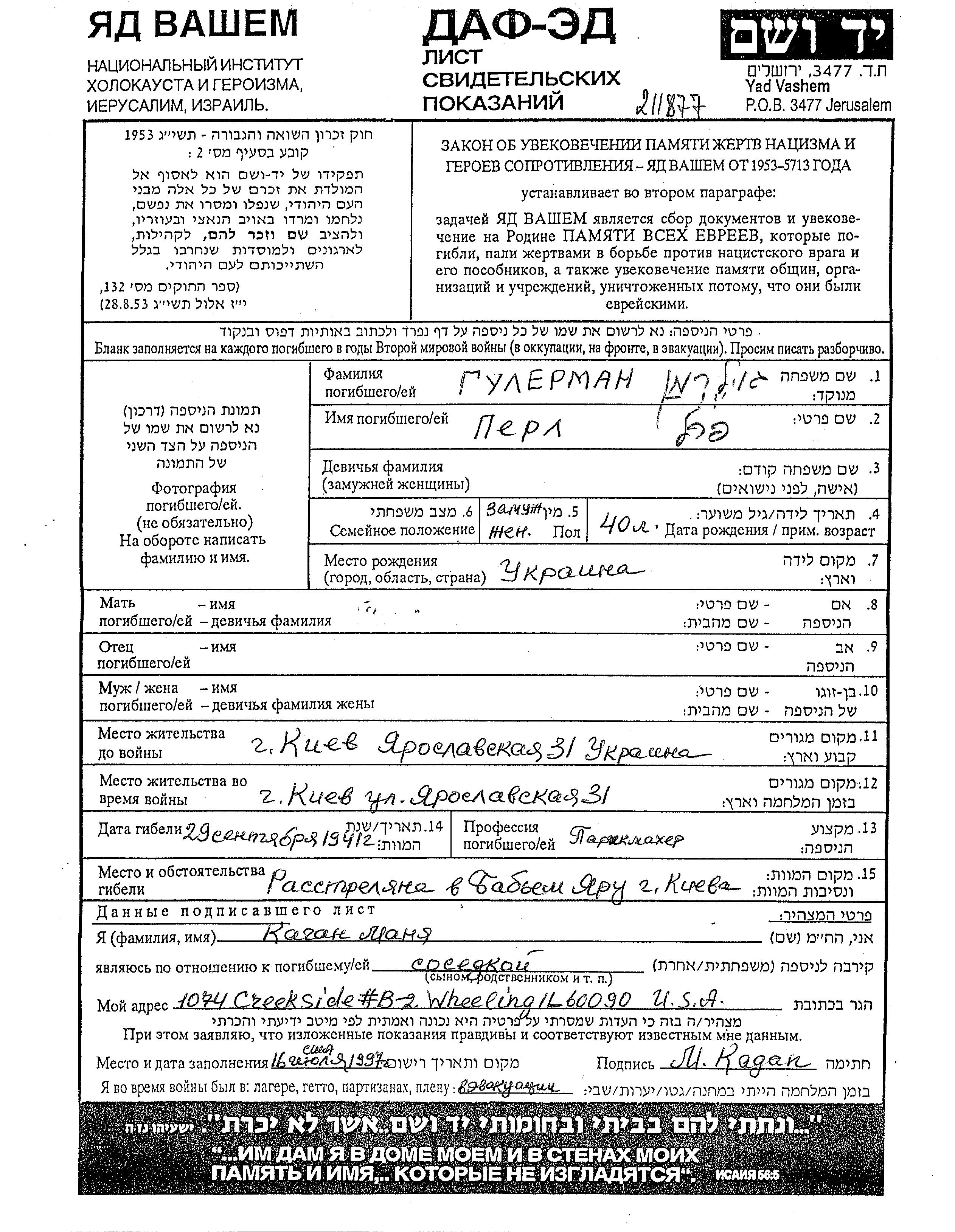 Perl Gulerman wurde im Jahr 1901 in Ukraine (UdSSR) geboren. Sie war Friseur/-in und Verheiratet. Vor dem Zweiten Weltkrieg lebte sie in Kiyev, Ukraine (UdSSR). Während des Krieges war sie in Kiyev, Ukraine (UdSSR).