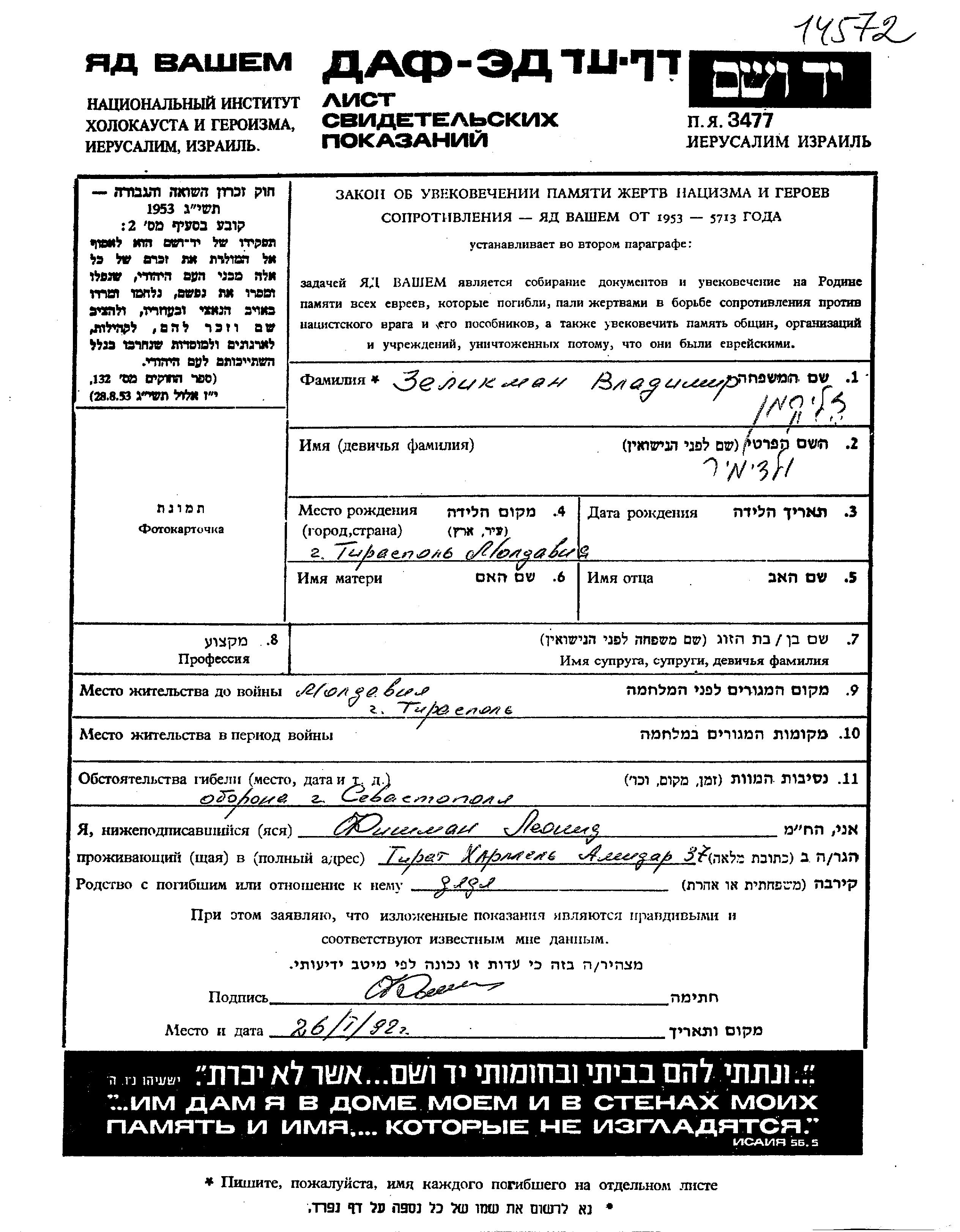 Vladimir Zelikman wurde in Tiraspol, Ukraine (UdSSR) geboren. Vor dem Zweiten Weltkrieg lebte er in Tiraspol, Ukraine (UdSSR). Während des Krieges war er in die Sowjetischen Streitkräfte. Vladimir im Militärdienst umgekommen. Todesort: Sevastopol, Russland (UdSSR).