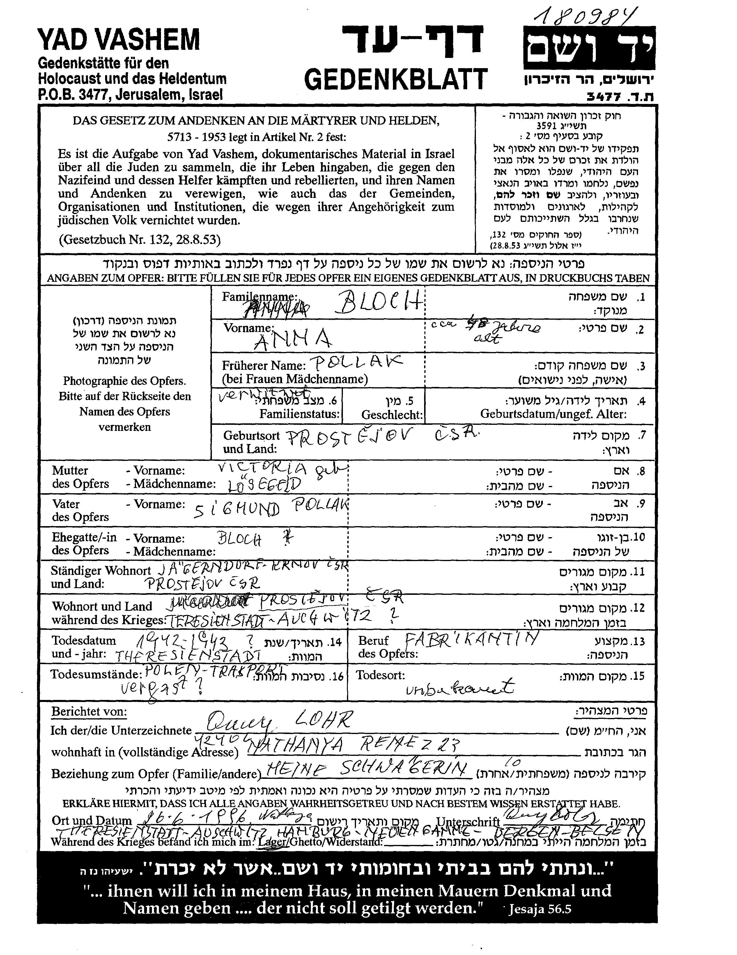 Anna Bloch, geb. Pollak wurde im Jahr 1895 in Prostejov, Tschechoslowakei geboren. Sie war die Tochter von Zigmund und Victoria, geb. Loesegeld. Sie war Industrielle/-r und Verheiratet. Vor dem Zweiten Weltkrieg lebte sie in Prostejov, Tschechoslowakei. Während des Krieges war sie in Tschechoslowakei.
