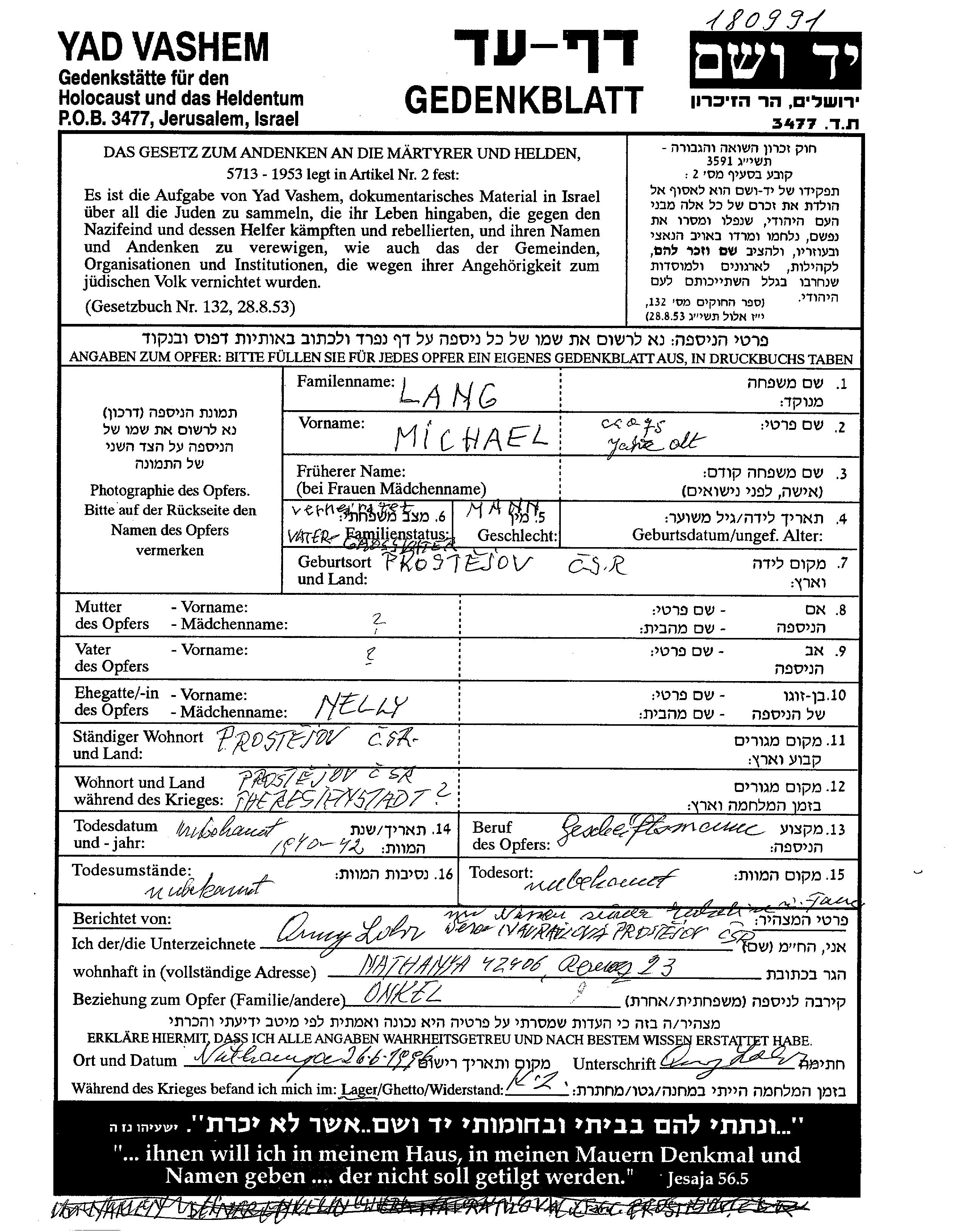 Michael Lang wurde in Prostejov, Tschechoslowakei geboren. Er war Geschäftsmann und mit Nelly Verheiratet. Vor dem Zweiten Weltkrieg lebte er in Prostejov, Tschechoslowakei. Während des Krieges war er in Tschechoslowakei.