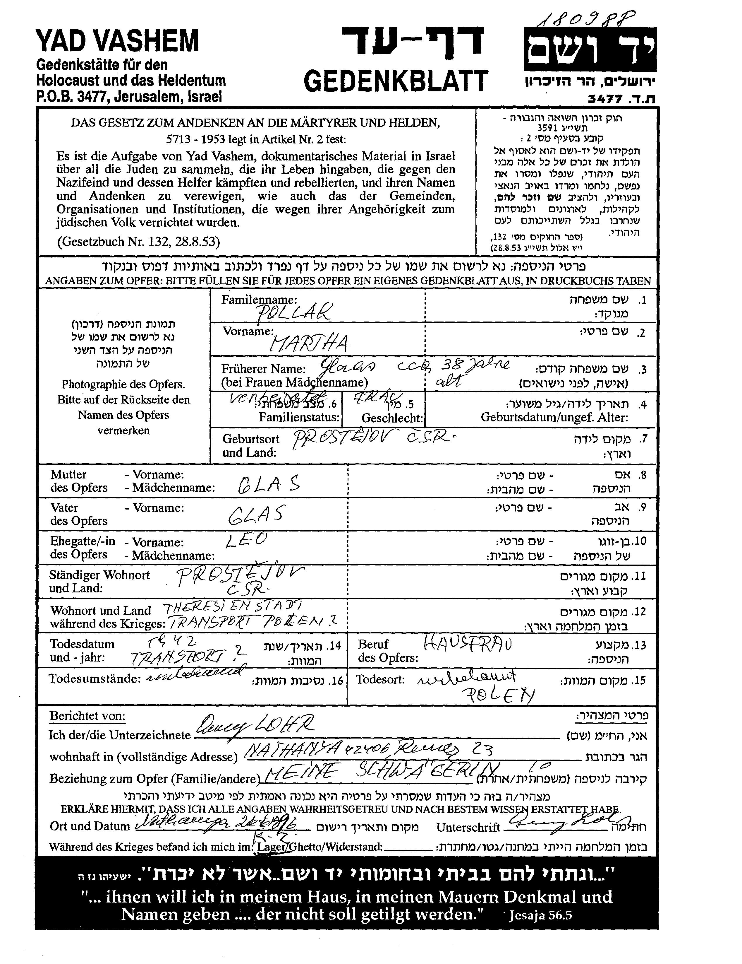 Marta Pollak, geb. Glass wurde im Jahr 1904 in Prostejov, Tschechoslowakei geboren. Sie war Hausfrau und mit Leo Verheiratet. Vor dem Zweiten Weltkrieg lebte sie in Prostejov, Tschechoslowakei. Während des Krieges war sie in Tschechoslowakei.