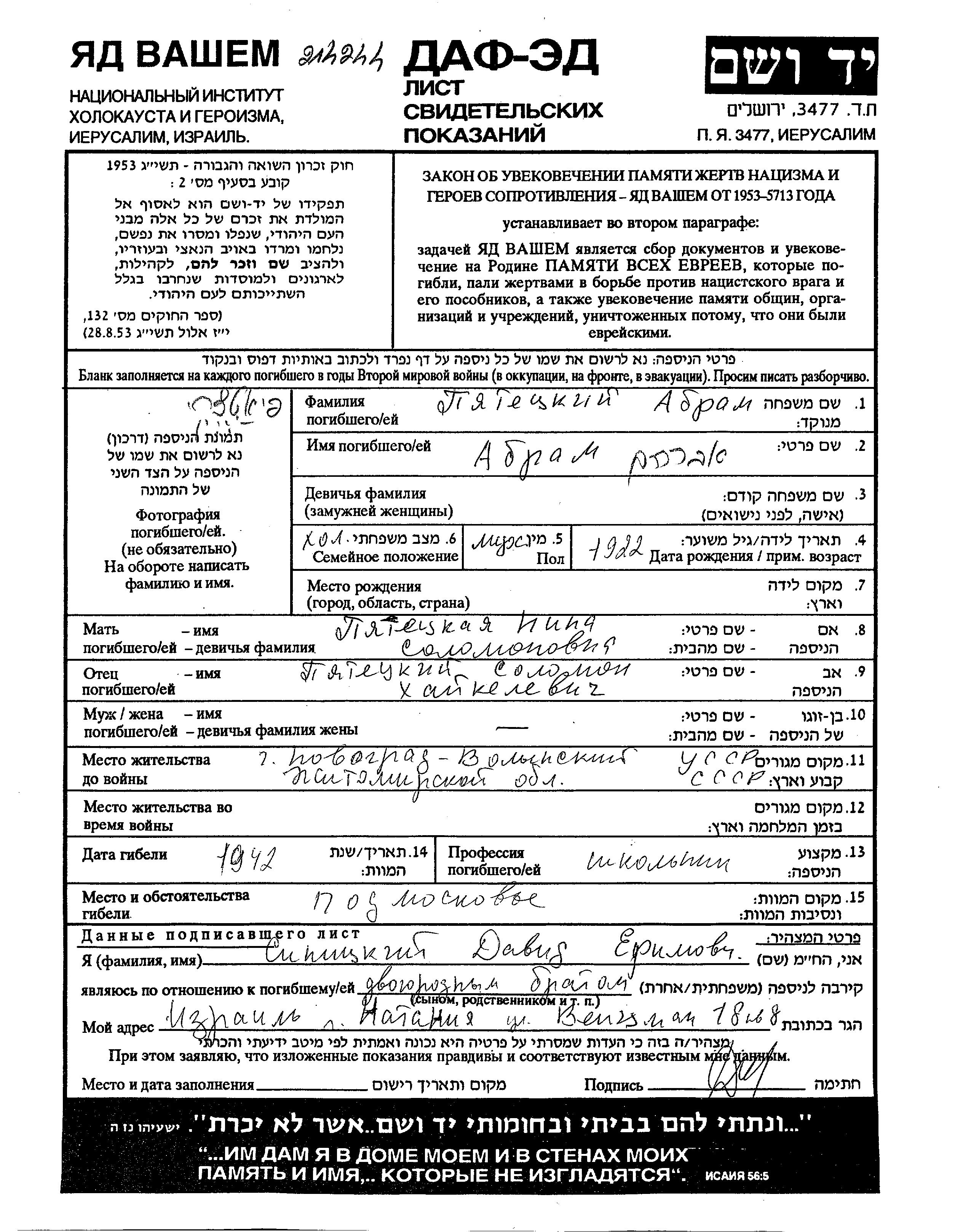 Abram wurde in der Schoah ermordet. Todesort: Moskva, Russland (UdSSR) im Jahr 1942.