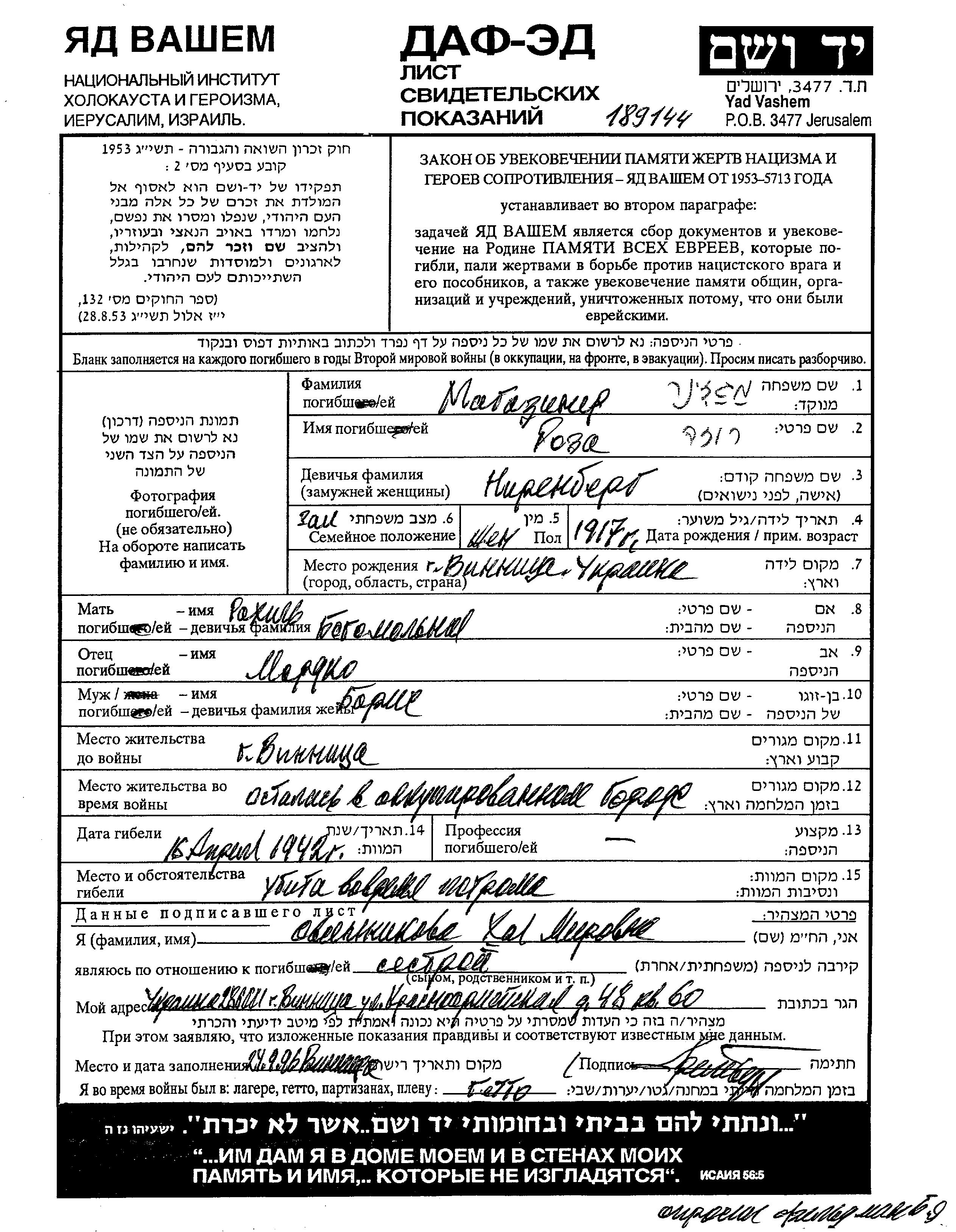 Roza Magaziner, geb. Nirenberg wurde im Jahr 1917 in Vinnitsa, Ukraine (UdSSR) geboren. Sie war die Tochter von Mordko und Rakhil, geb. Bogomolni. Sie war mit Boris Verheiratet. Vor dem Zweiten Weltkrieg lebte sie in Vinnitsa, Ukraine (UdSSR). Während des Krieges war sie in Vinnitsa, Ukraine (UdSSR).