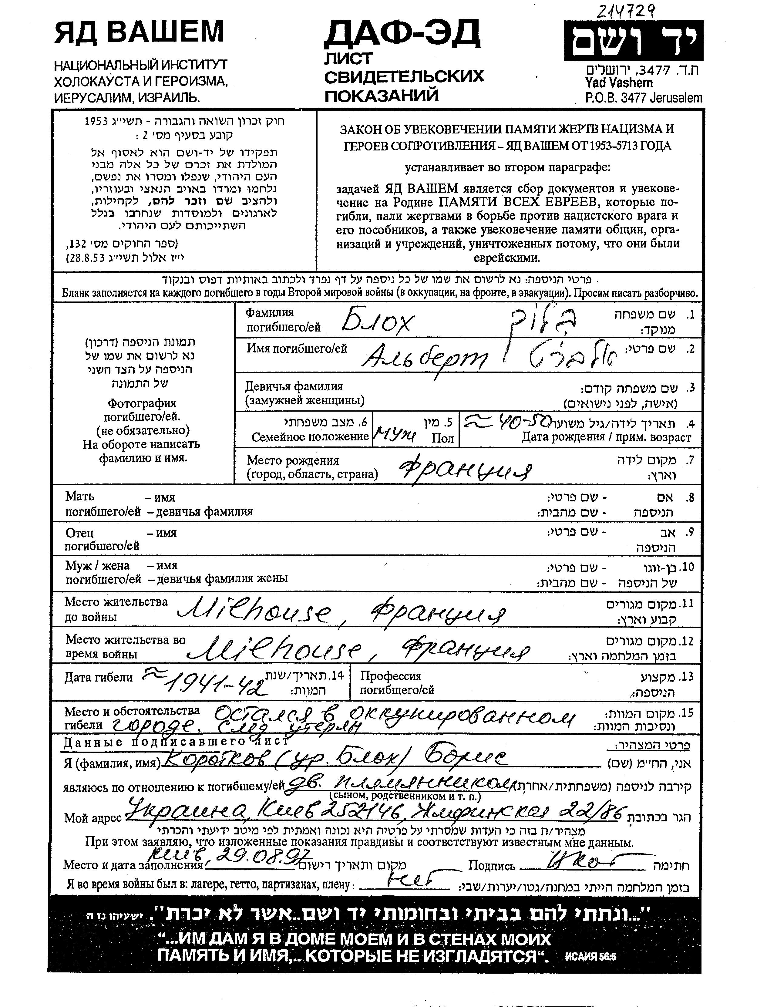 Albert Blokh wurde im Jahr 1901 in Frankreich geboren. Vor dem Zweiten Weltkrieg lebte er in Mulhouse, Frankreich. Während des Krieges war er in Mulhouse, Frankreich.