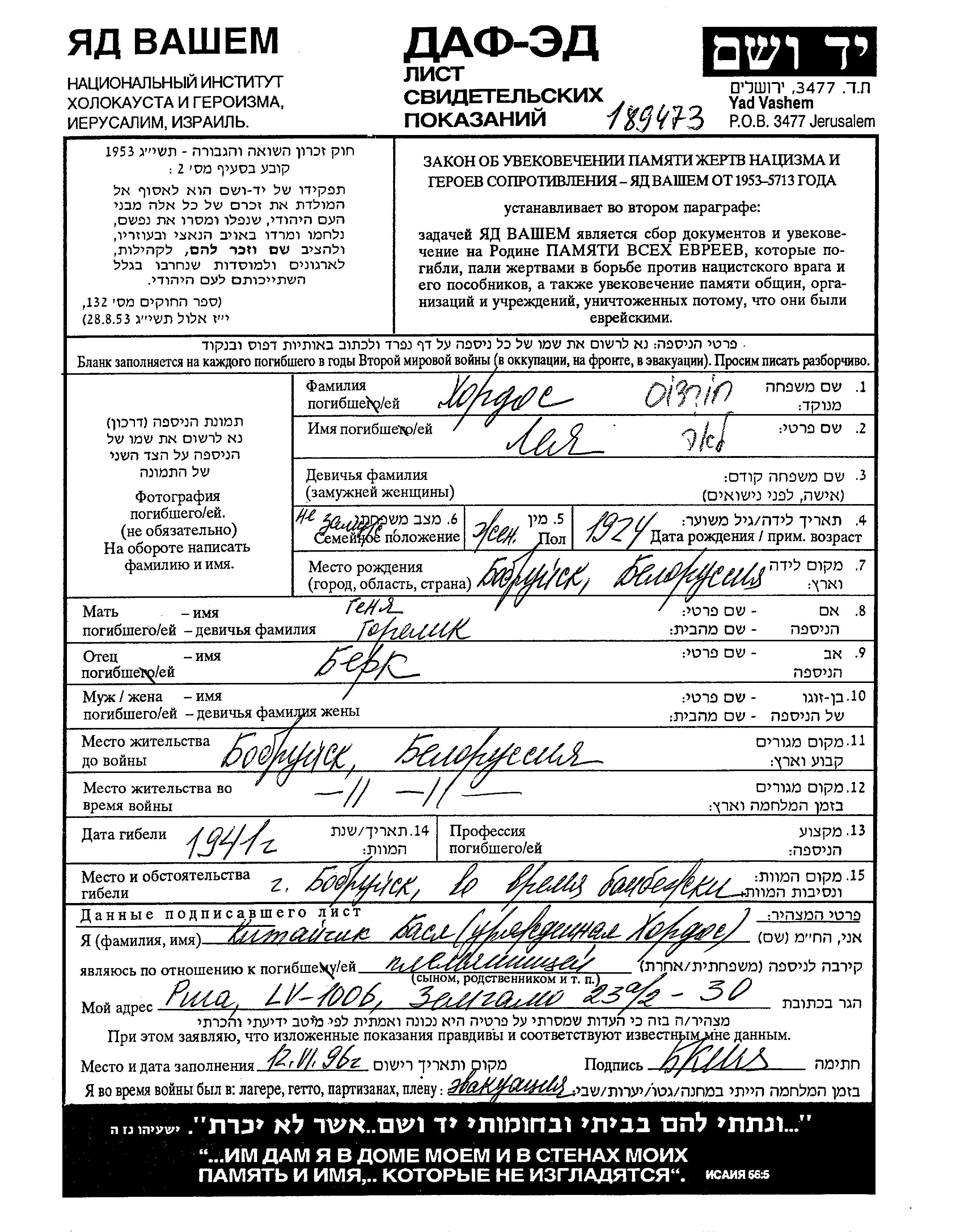 Lea Khordos wurde im Jahr 1924 in Bobruysk, Weißrussland (UdSSR) geboren. Sie war die Tochter von Berk und Genya, geb. Gorelik. Sie war Kind. Vor dem Zweiten Weltkrieg lebte sie in Bobruysk, Weißrussland (UdSSR). Während des Krieges war sie in Bobruysk, Weißrussland (UdSSR).