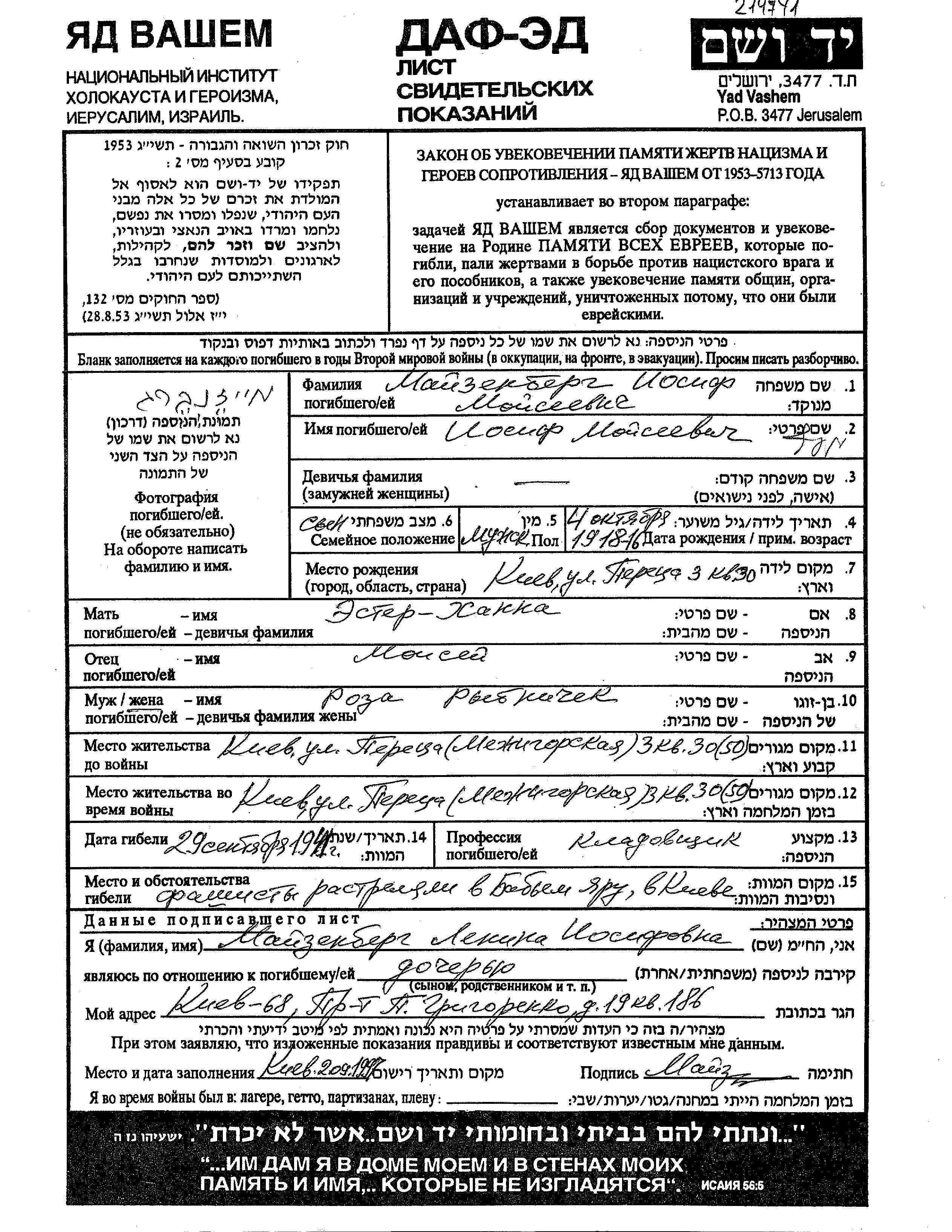 Iosif Maizenberg wurde im Jahr 1916 in Kiyev, Ukraine (UdSSR) geboren. Er war der Sohn von Moisei und Ester Khana. Er war Lagerverwalter und mit Roza Verheiratet. Vor dem Zweiten Weltkrieg lebte er in Kiyev, Ukraine (UdSSR). Während des Krieges war er in Kiyev, Ukraine (UdSSR).