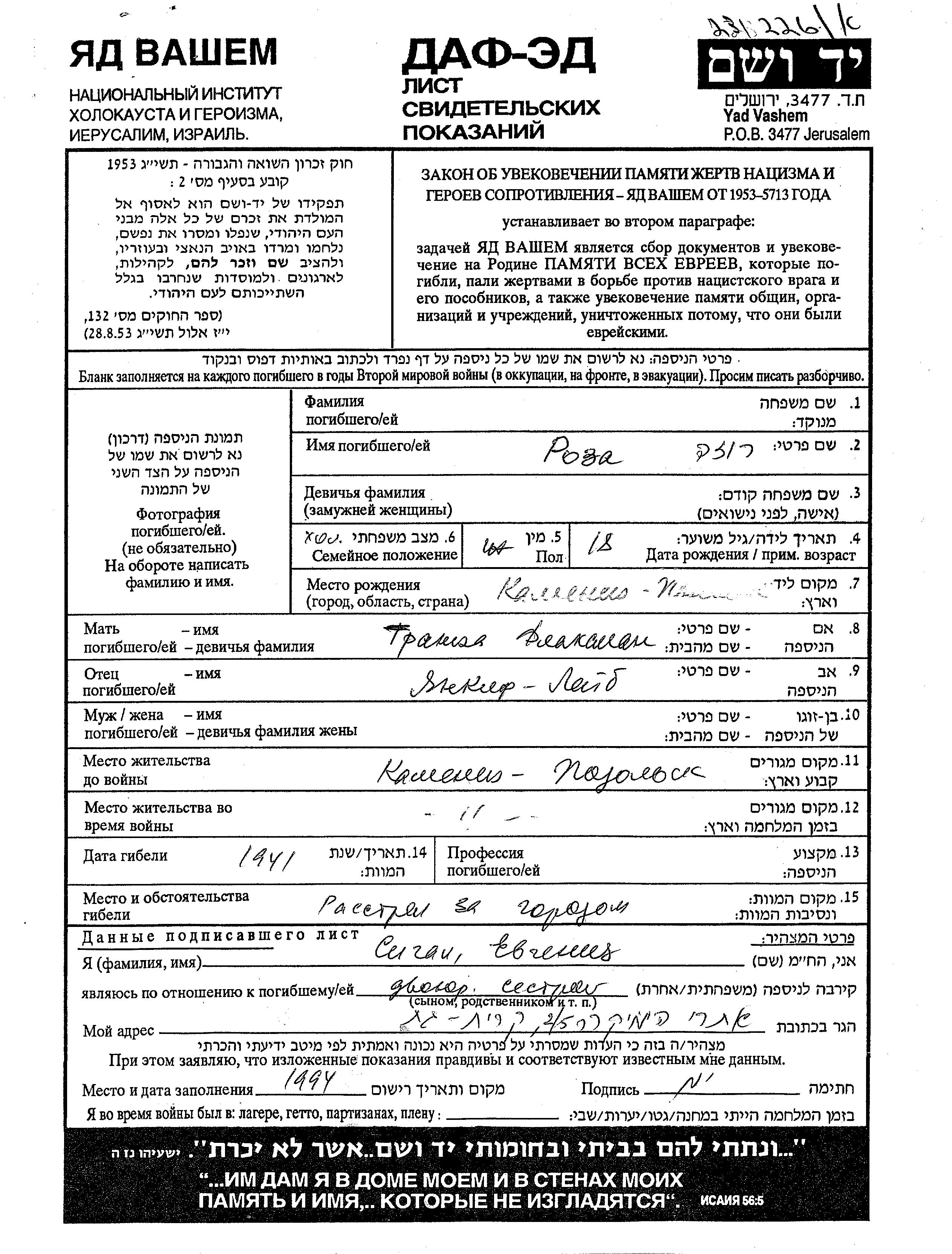 Roza wurde in der Schoah ermordet. Todesort: Kamenets Podolskiy, Ukraine (UdSSR) im Jahr 1941.